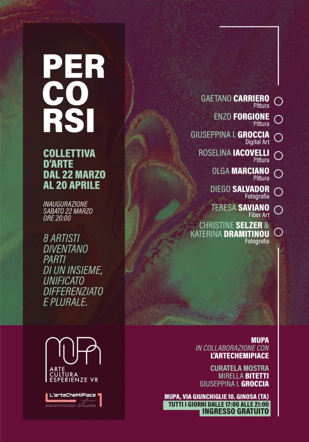 La mostra "Percorsi", ospitata dal MuPa – Palazzo Multimediale di Ginosa (TA) dal 22 marzo al 20 aprile 2025, nasce con l’intento di intrecciare diverse voci artistiche in un unico discorso espositivo, mantenendo al contempo la pluralità e l’autonomia di ogni linguaggio.