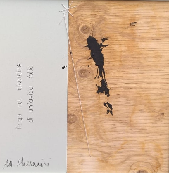 Nei suoi lavori troviamo frasi e parole, con aggiunte di colore che richiamano l’attenzione, e inserimenti di materiali insoliti, comunque ben equilibrati nello spazio minimalista della tavola.