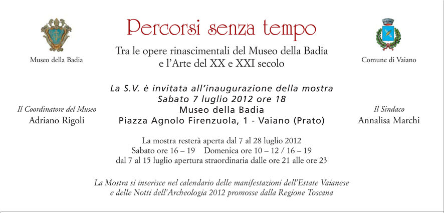 Si inaugura sabato 7 luglio al Museo della Badia di Vaiano la mostra “Percorsi senza tempo” a cura di Adriano Rigoli e Giuseppe Massimini. La rassegna mette a colloquio i capolavori rinascimentali del Museo della Badia e l’arte del XX e XXI secolo