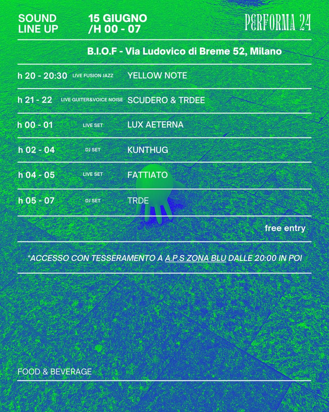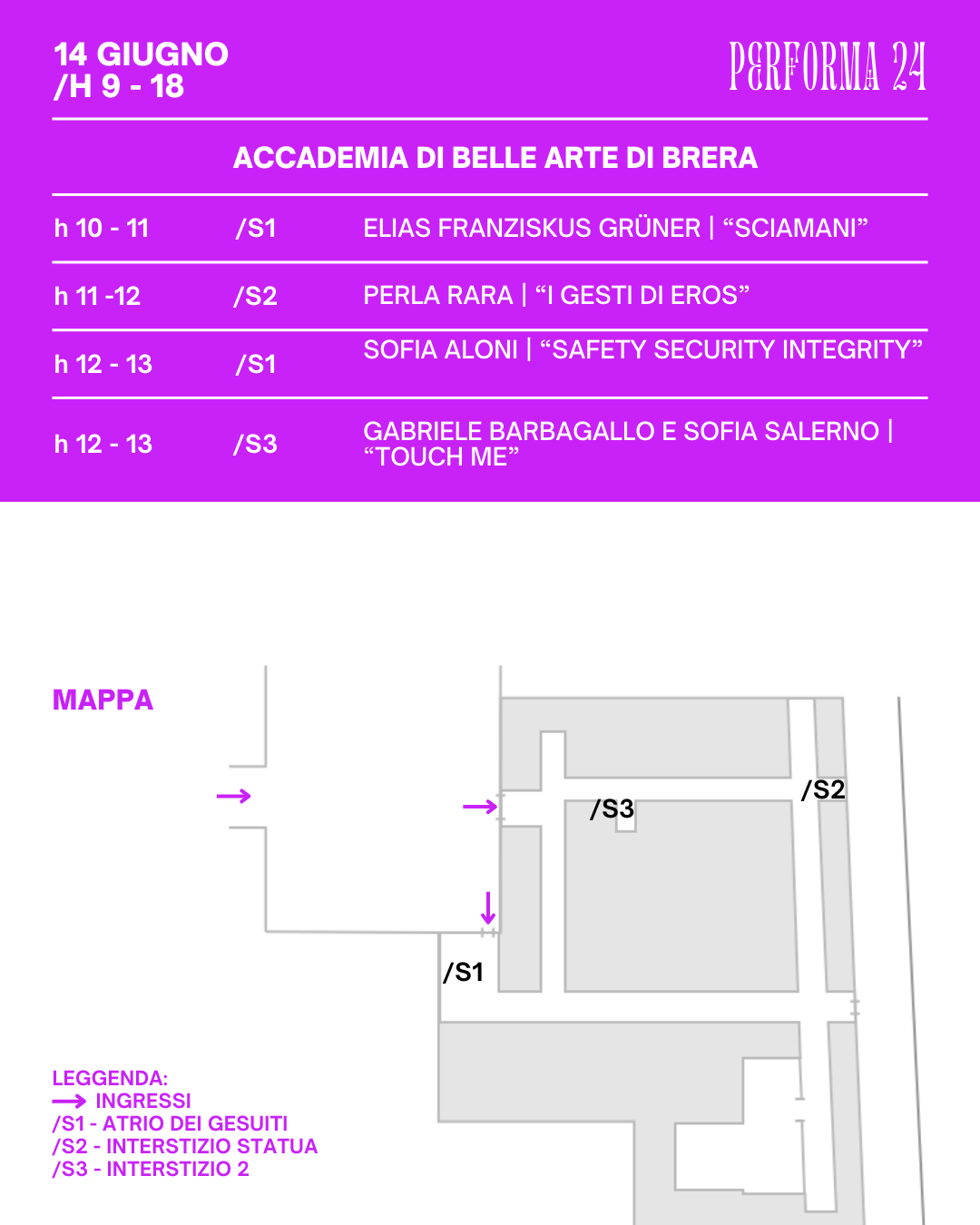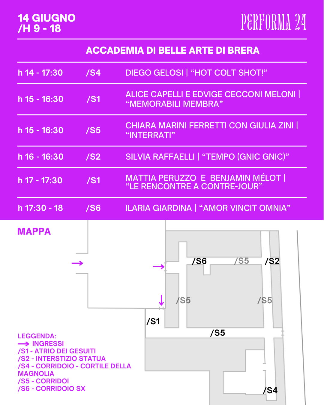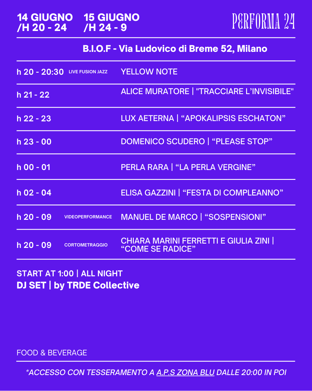 PERFORMA24 è un evento d’arte contemporanea che si sviluppa a partire dal concetto di performance continua e diffusa, un atto unico dalla durata di 24 ore in cui si susseguono in una programmazione continuativa diversi performer che indagano le possibilità del corpo. Il progetto prende forma nel 2022 a cadenza biennale, nato da un’idea dell’artista Nicola Tineo, giunge oggi alla seconda edizione curata dall’attuale team dell’A.P.S. Zona Blu composto da Nicola Tineo, Viola Lo Monaco e Francesca De Chiara con la collaborazione dei tirocinanti dell’Accademia di Belle Arti di Brera (Denisa Patrascan e Ginevra Smerigli). La seconda edizione pone in comunicazione trasversale due diverse sedi: l’ambiente accademico dell’Istituzione dell’Accademia di Belle Arti di Brera e B.I.O.F. in Via Ludovico di Breme 52, Milano.