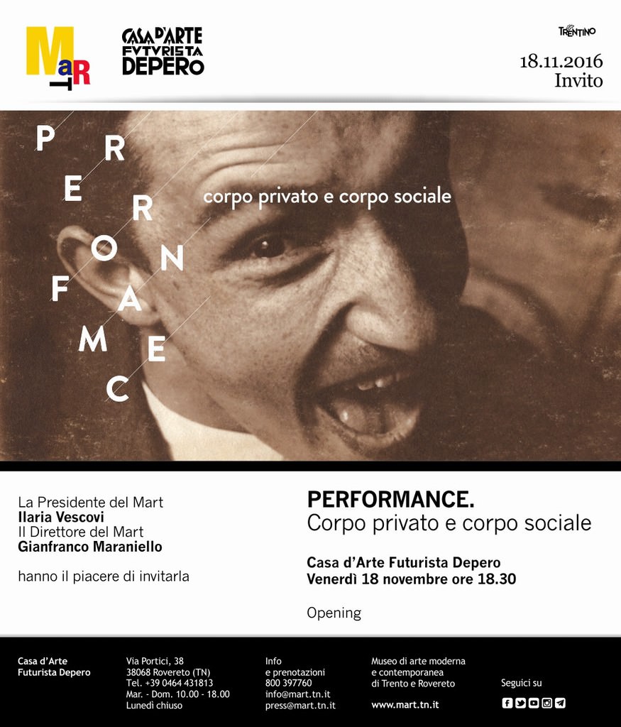 A partire dal multiforme ingegno di Fortunato Depero, la mostra Performance. Corpo privato e corpo sociale approfondisce il tema del corpo come strumento e luogo di ricerca attraverso un nucleo di opere provenienti dal Mart e una selezione di documenti dell’Archivio del ‘900. In mostra anche tre video esemplari di performance di Yoko Ono (Cut Piece, 1964), Vito Acconci (Applications, 1970) e Sarenco (Mein Gott Nein Gott, 1970).