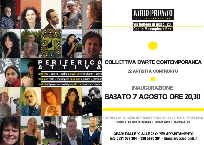PERIFERICA ATTIVA è una mostra collettiva d’arte contemporanea allestita in uno spazio inconsueto: l’atelier dell’artista Uccio Biondi che spalanca per la prima volta le porte della sua riserva privata. E’ una maniera per dialogare sul senso della periferia-centro e viceversa. Presenti 22 artisti di età, provenienza e medium diversi. A confronto i video di Davide Pepe, Fionnuala Mc Kenna, le fotografie di Giuseppe Affinito, Antonio Livello, Nico Elia, Caterina Gerardi, Francesca Speranza, Massimo Orsini, Daniela Calzolari, Veronica Camastra, le installazioni di Mari Pappalettera, Enza Santoro, le tecniche miste e i dipinti di Teresa Ciulli, Cosimo Epicoco, Monica Lisi, Valentina D’Andrea, Angelica Dragone, M. Valentina Dario, l’istallazione intermediale di Uccio Biondi, le sculture di Oriano Zampieri, Carmelo Conte e Giovanni Carpignano.