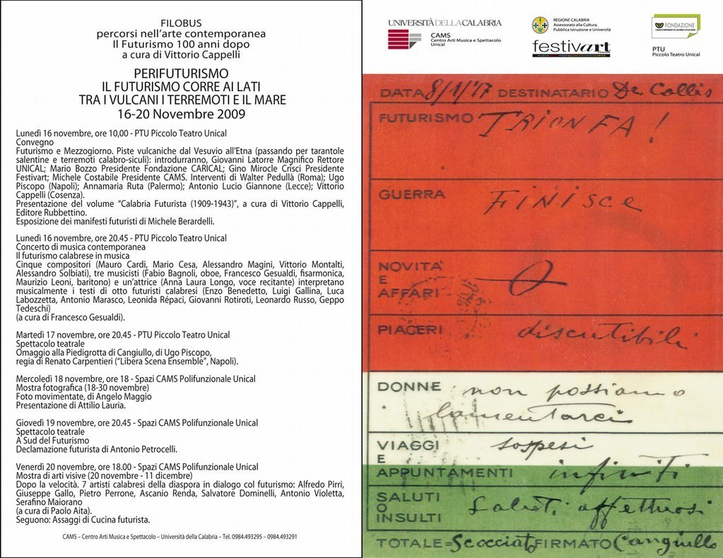 Il convegno su “Futurismo e mezzogiorno”, che si terrà lunedì 16 novembre dalle ore 10 nel Ptu Piccolo Teatro Unical, dopo i saluti del Rettore Giovanni Latorre, del presidente della Fondazione Carical Mario Bozzo, del responsabile di Festivart Gino Mirocle Crisci e del presidente del Cams Michele Costabile, prevede gli interventi degli studiosi Walter Pedullà, Ugo Piscopo, Anna Maria Ruta, Antonio Lucio Giannone, oltre a Vittorio Cappelli, curatore anche del libro “Calabria Futurista” che sarà presentato nella stessa mattina. Sempre nel Ptu giorno 16 è programmata l’esposizione dei manifesti del cosentino Michele Berardelli e in serata, alle ore 20.45, il concerto di musica contemporanea “Il futurismo calabrese in musica” a cura di Francesco Gesualdi.