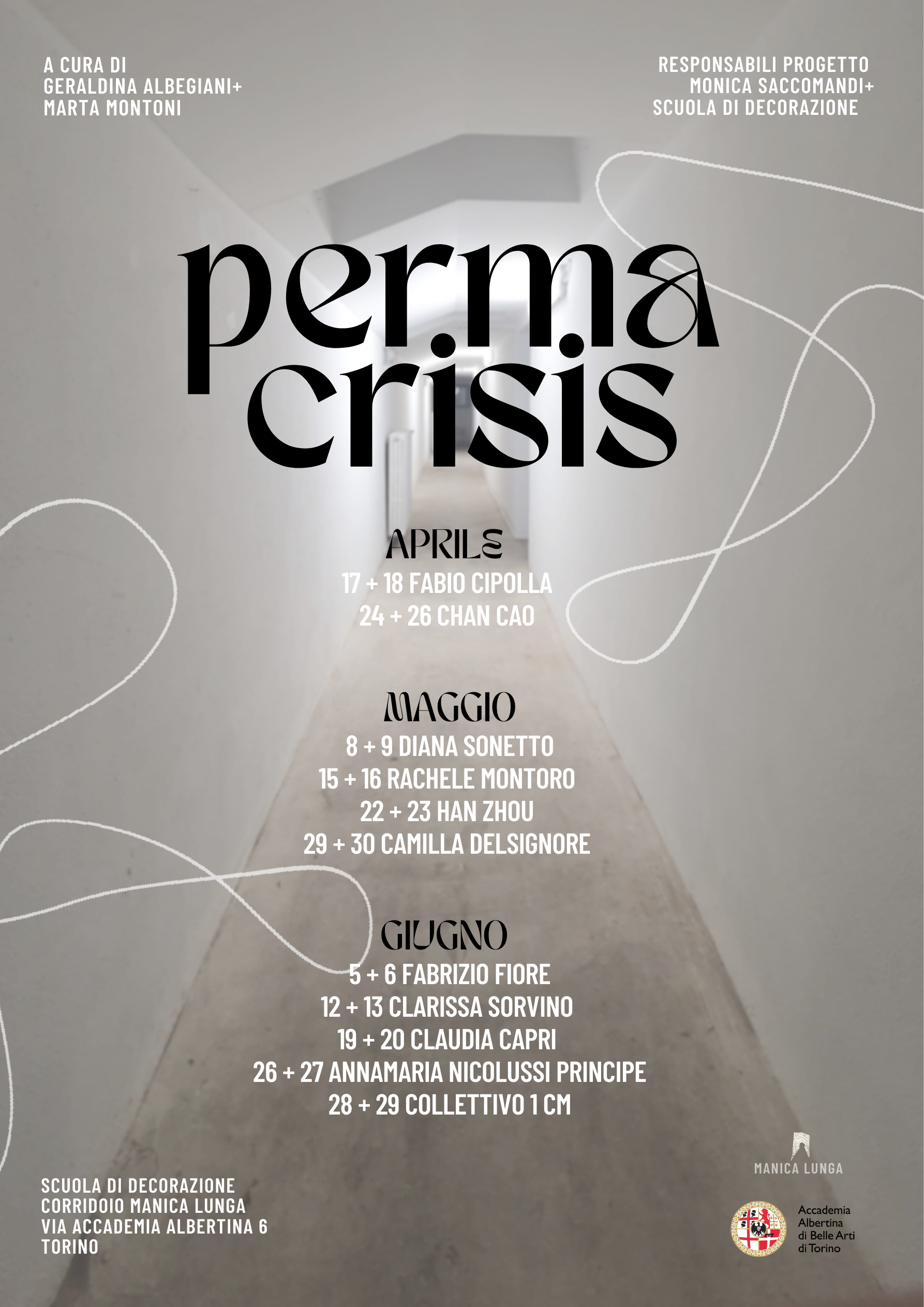 Nella Manica Lunga, lungo corridoio antistante alle aule di Decorazione dell’Accademia Albertina di Torino, avrà luogo Permacrisis, una serie di mostre a cura di Geraldina Albegiani e Marta Montoni su alcuni degli acronimi nati a partire del 2015 per definire specifiche condizioni di ansia sociale.
