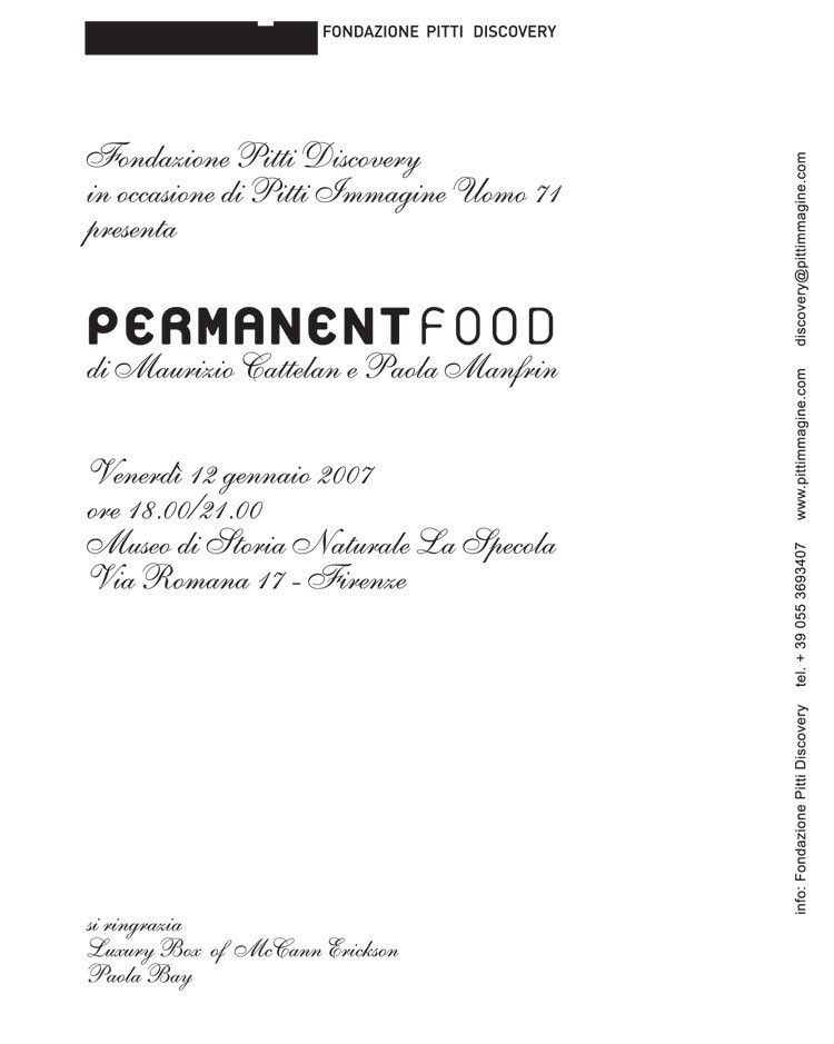 Con questo numero speciale di Permanent Food, che verrà presentato a Firenze venerdì 12 gennaio, la Fondazione Pitti Discovery continua il suo progetto di sperimentazione, ricerca, indagine e presentazione dei complessi e profondi rapporti tra moda e cultura contemporanea.