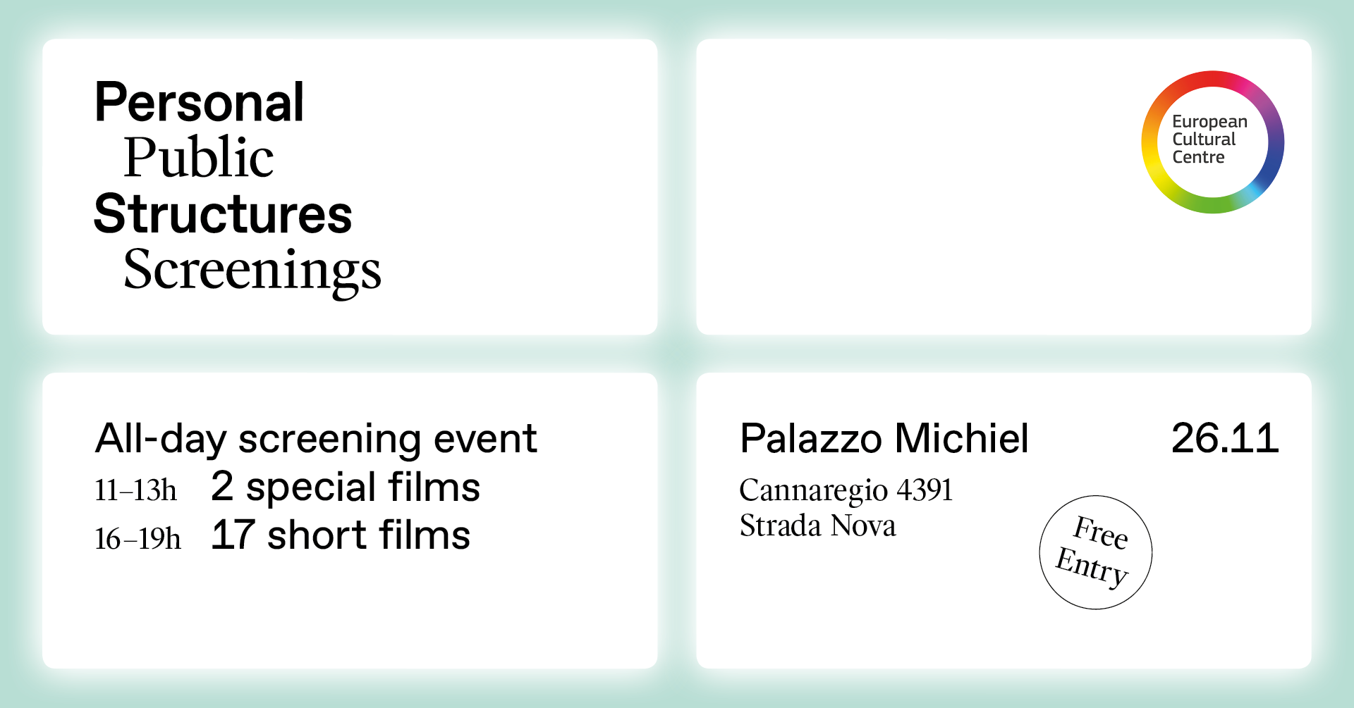 The European Cultural Centre is delighted to organise the first cycle of Personal Structures | Public Screenings, an exclusive screening event presenting videos and films by selected participants of the Personal Structures exhibition 2022. Full program available on the website.