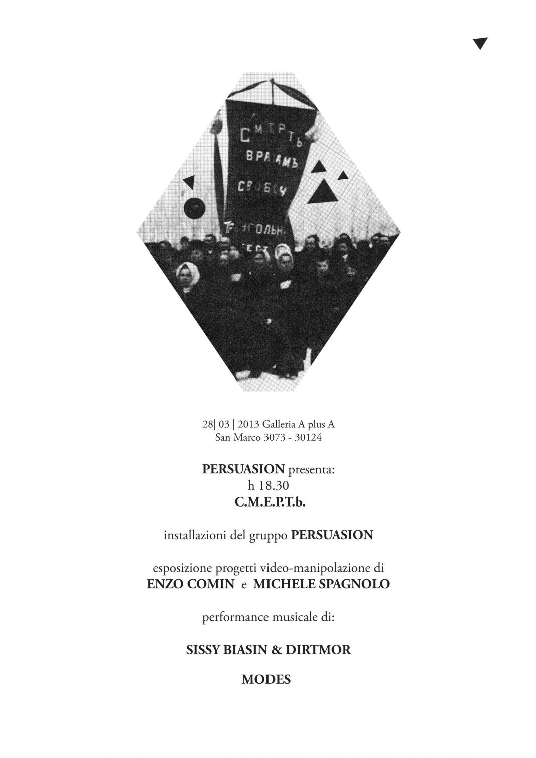 Persuasion presenta CMEPTb. Installazioni del gruppo Persuasion, esposizione progetti video-manipolazione di Enzo Comin e Michele Spagnolo, performance musicale di Sissy Biasin & Dirtmor + Modes.