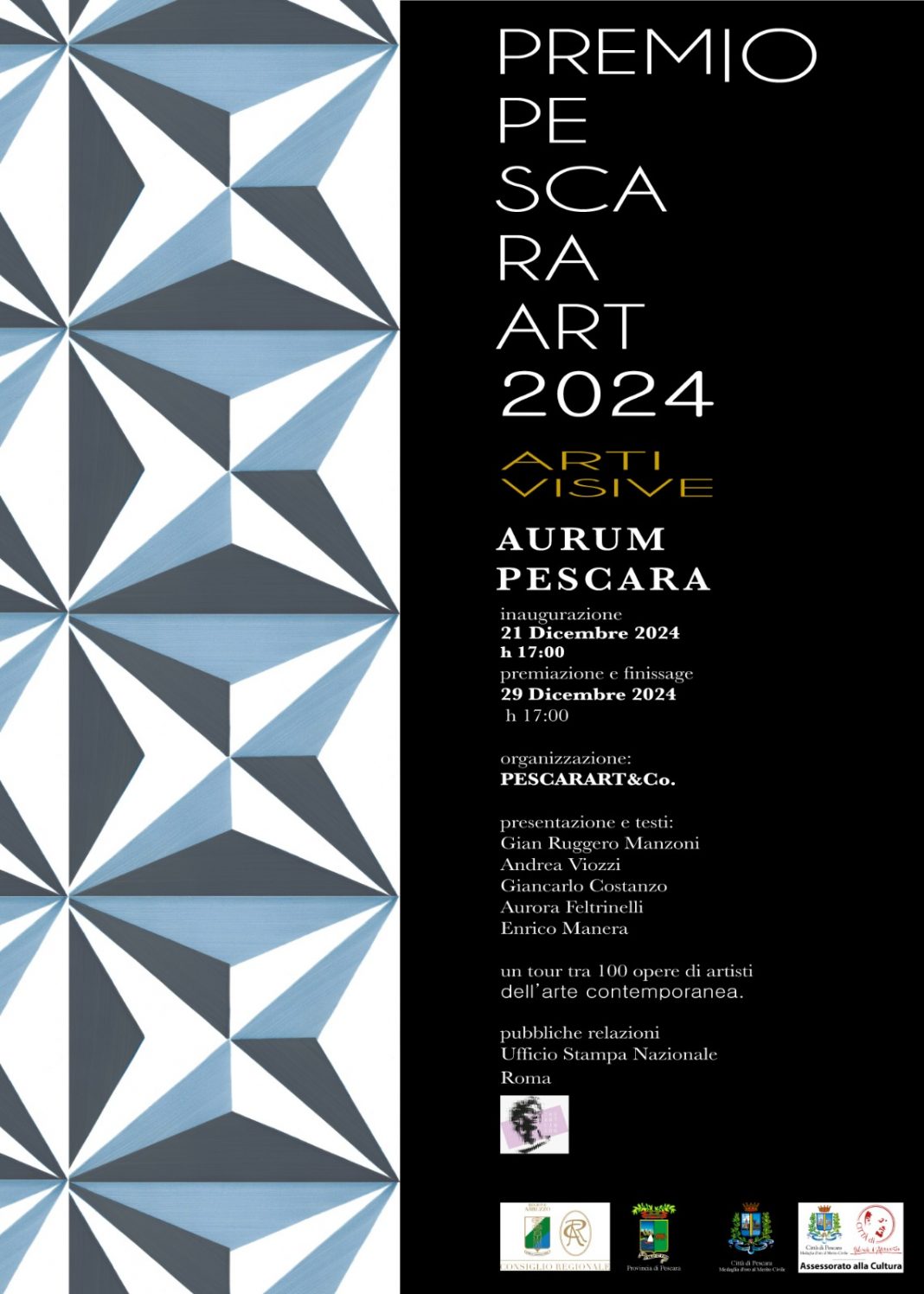 Il Premio PescarArt , coordinato da Giancarlo Costanzo, è realizzato con il Patrocinio della Regione Abruzzo, Provincia di Pescara, e l’Assessorato alla Cultura del Comune di Pescara.