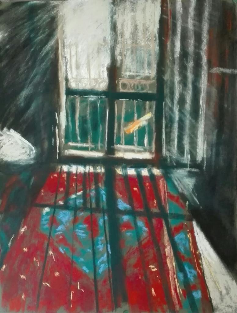 La tessitura morbida del pastello si rivela la tecnica più adatta alla raffigurazione di questo limbo rappresentativo in bilico tra la realtà ritratta nelle fotografie degli ambienti e l’elaborazione artistica intrisa della cifra pittorica dell’autore.