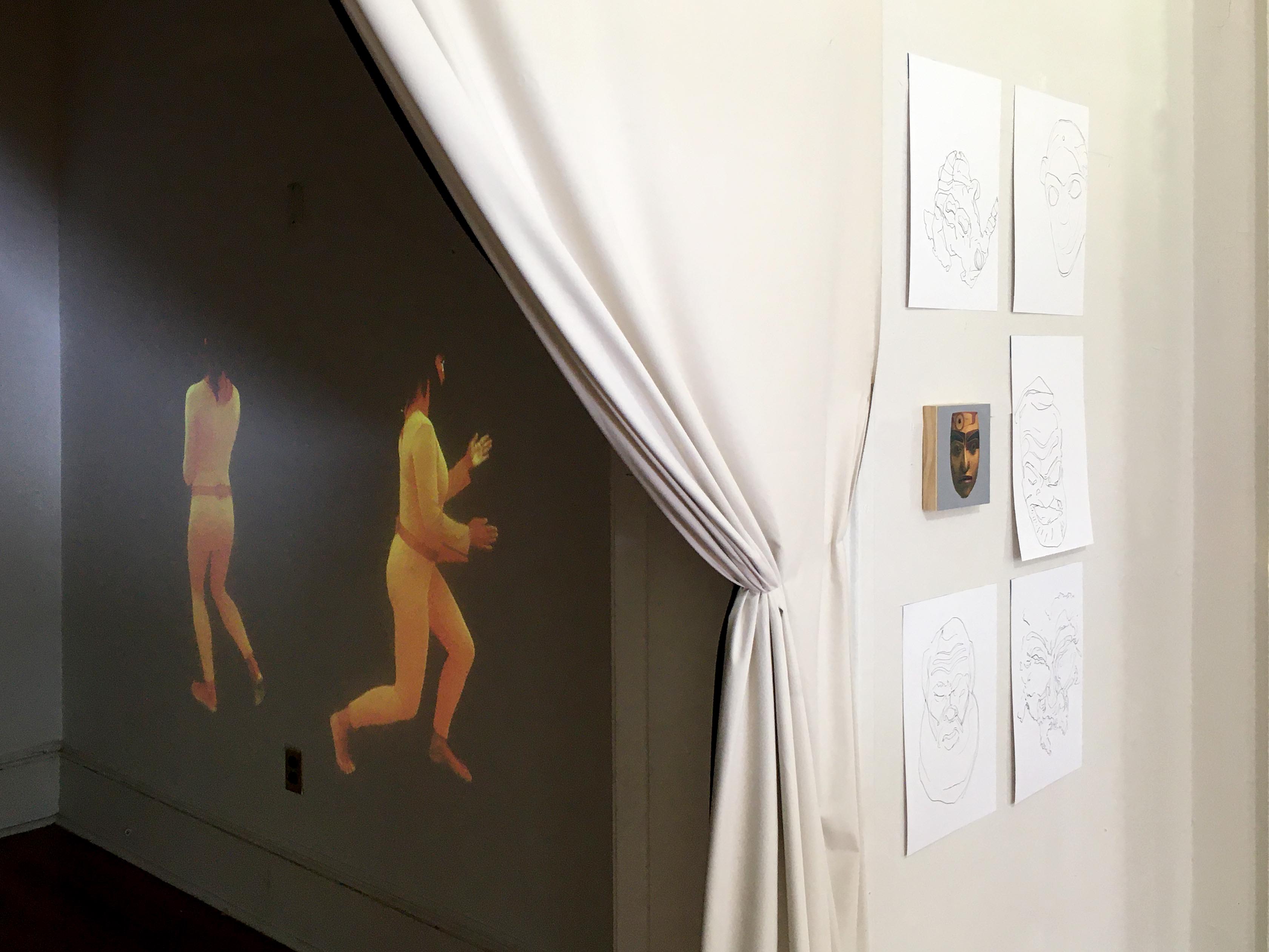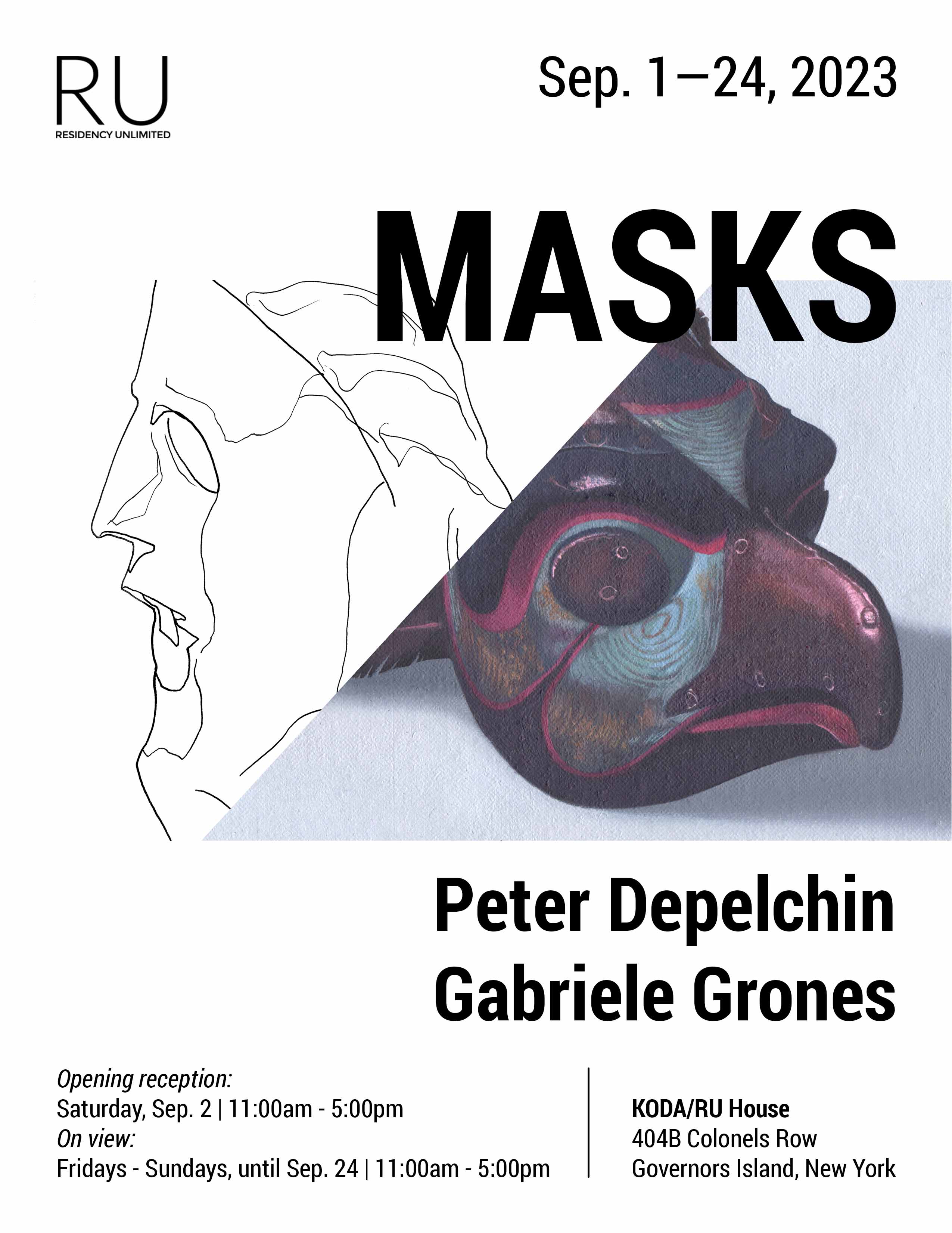 “Masks”, è la doppia personale degli artisti di Residency Unlimited (RU), Gabriele Grones e Peter Depelchin, che offre un'escursione visiva attraverso il disegno, la pittura e l'installazione video. Nelle sue opere, Peter Depelchin esamina la rappresentazione dei volti attraverso le maschere, le distorsioni e la morfologia facciale. L'immaginario che utilizza si origina dalle maschere fenicie, romane, greche, native americane e giapponesi, che poi l'artista traduce in raffigurazioni ibride di satiri e fauni. Gli elaborati disegni di Depelchin conducono lo spettatore da una singola maschera a una moltitudine di maschere stratificate, che ci entrano letteralmente sotto la pelle.