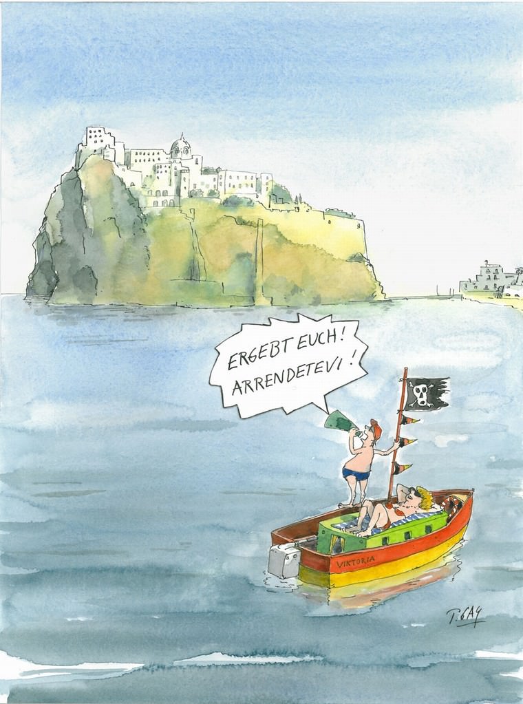 Ad agosto esce finalmente un libro sulla meta preferita e seconda patria di Peter Gaymann, Italien, Amore Mio, per i tipi di Mosaik bei Goldmann (Random House), ISBN 978-3-442-39 1438-7. Quale occasione migliore per presentare il libro a Ischia e rivelare in una mostra l’identità del suo vero amore italiano, Ischia, Amore Mio.