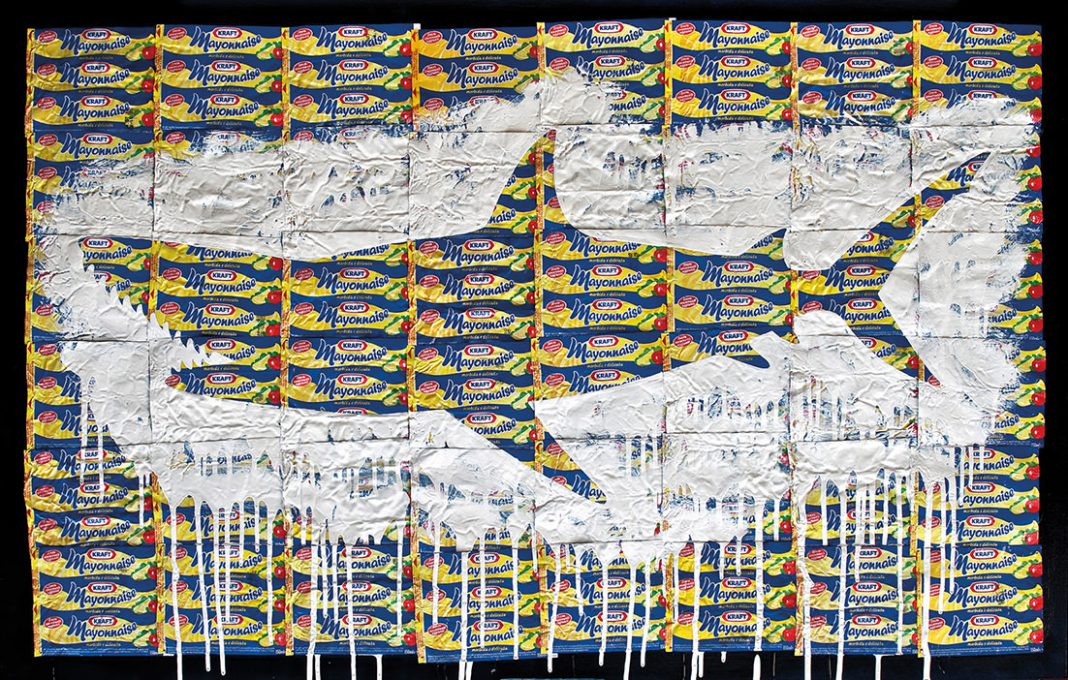 Giordano Redaelli si rivolge in maniera scherzosa ai prodotti di uso quotidiano; la scelta dei beni di consumo riconoscibili dal loro brand commerciale diventa specchio di una società e lascia affiorare il vissuto ed i ricordi che a quel prodotto sono legati. Le icone commerciali diventano il supporto su cui l’artista interviene pittoricamente. Fruitore del nostro tempo, Redaelli si trasforma in “sociologo” del contemporaneo; colleziona involucri ed etichette sulle quali dipinge simboli e spunti di narrazione. Con la tecnica del collage e del packaging dà vita a creazioni artistiche nelle quali riusciamo ad identificarci; la percezione della realtà e del nostro vivere quotidiano ci avvicina a queste opere. Redaelli, infatti, usa codici comuni che fanno breccia nella nostra storia di consumatori, di fruitori di pubblicità. Brand e messaggio pubblicitario sono associati all’intuizione, all’ironia di un gioco di rimandi. Redaelli strizza l’occhio alle icone del contemporaneo: bellissimo l’esempio de “Lo squalo da 12 dollari”, opera del 2009, dove la sagoma di uno squalo si staglia sullo sfondo delle confezioni di Mayonese Kraft. Non é il solito pesciolino che si mangia con la maionese, bensì uno squalo che fa il verso a quello ben più costoso di Damien Hirst…