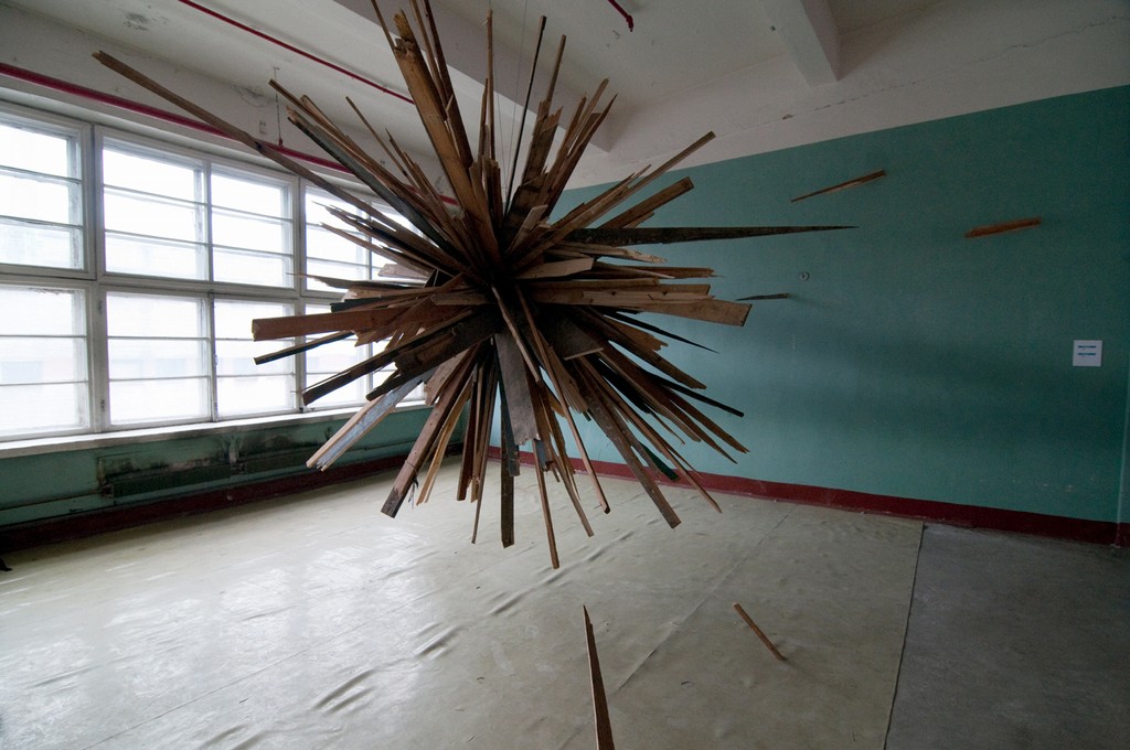 Di dimensioni monumentali è invece la seconda installazione intitolata Wooden Explosion, un’esplosione di schegge di legno che viene congelata dalle pareti della stanza della galleria che pare non riuscire a controllarne la potenza. Un’esplosione bloccata e silenziosa, che paradossalmente crea una sorta di rumore metafisico. Wooden Explosion sembra anche, nella sua muta ieraticità, esprimere un atto di ribellione al vuoto sterile della galleria, alla costruzione politica e sociale dello spazio pubblico in generale e a quello dell’arte in particolare. L’artista affida a sé stesso il non facile compito di fissare e immobilizzare la frenesia, l’irreversibile natura del mondo all’interno delle pareti di una stanza. Esplosione Silenziosa è un ossimoro che in questo caso diventa metafora del processo che accade nella mente dell’uomo contemporaneo. Per l’artista ”Lo stress continuo, l’aggressione e la pressione che vengono dal mondo esterno alla fine provocano un’esplosione che si fissa nel tempo e nello spazio della coscienza di ciascun individuo“.
