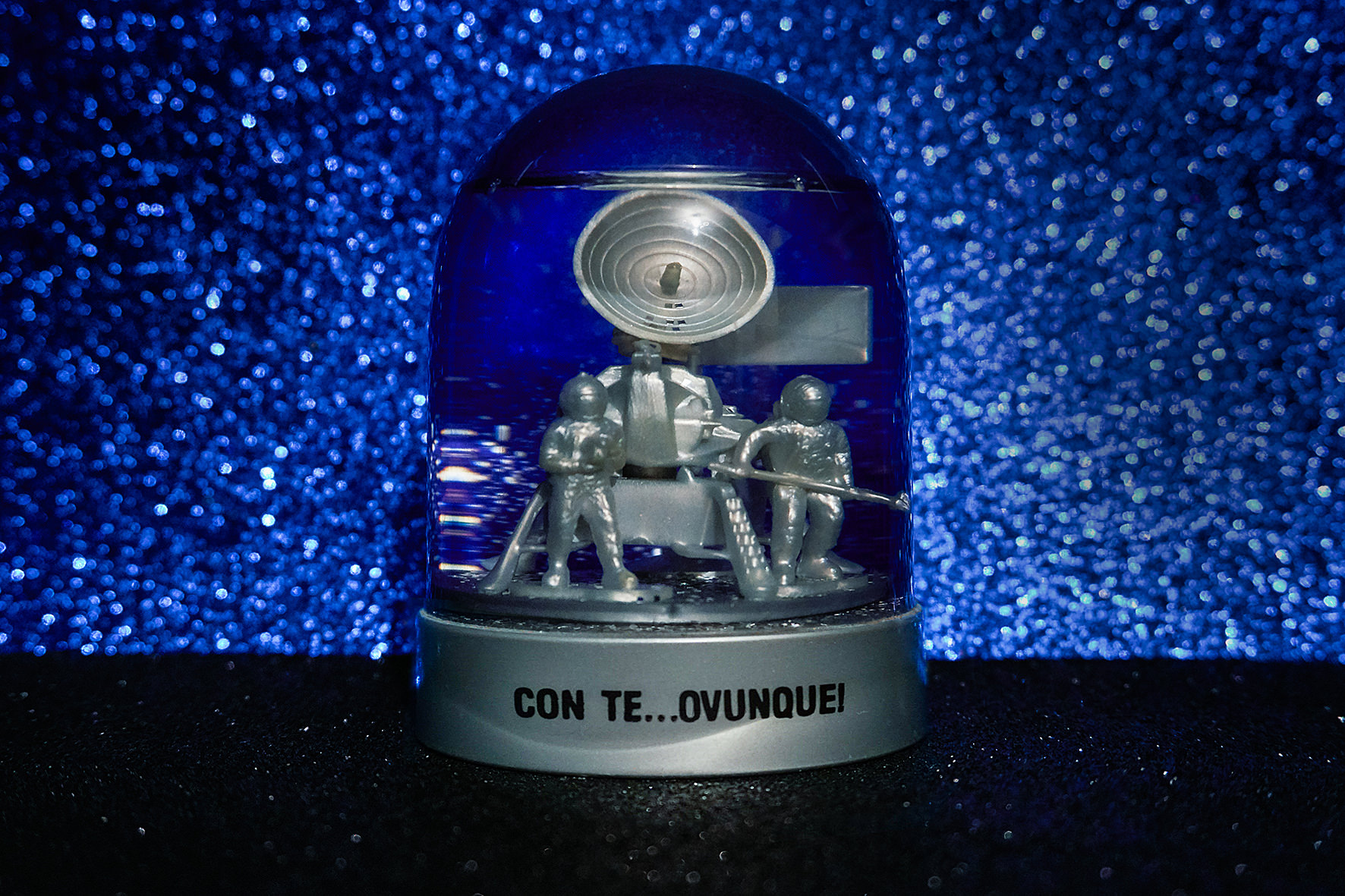 L’installazione principale che dà il titolo alla mostra, rappresenta una boule de neige, oggetto ricollegabile soprattutto agli anni Ottanta e Novanta che riporta in superficie il bambino che è in ognuno di noi. Opera a 6 mani, la boule de neige, di imponenti dimensioni e aperta come un’immagine pop-up, parla di mondi spaziali, di alieni, di racconti che vedono noi stessi come protagonisti. Sono tre racconti diversi, uno per ogni parte, che si intrecciano tra di loro in quanto parlano di un’immaginazione tipica di un bambino e delle esperienze illusorie che si possono vivere in tenera età come da adulti. Da una parte Emilia Maria Chiara Petri utilizzando l’anamorfosi altera il piano visivo e la superficie pittorica per far evolvere l’immagine di una stessa realtà attraverso diversi punti di vista. Un racconto intimista e sfaccettato si proietta verso lo spettatore catturandolo in una ricerca di ciò che compone l’immagine. Dall’altro i PetriPaselli, attraverso la presentazione di oggetti derivanti dalla vita comune, quasi pop, trasportano lo spettatore in un racconto apparentemente più giocoso, che rimanda al ricordo della concezione passata del futuro e dello spazio.