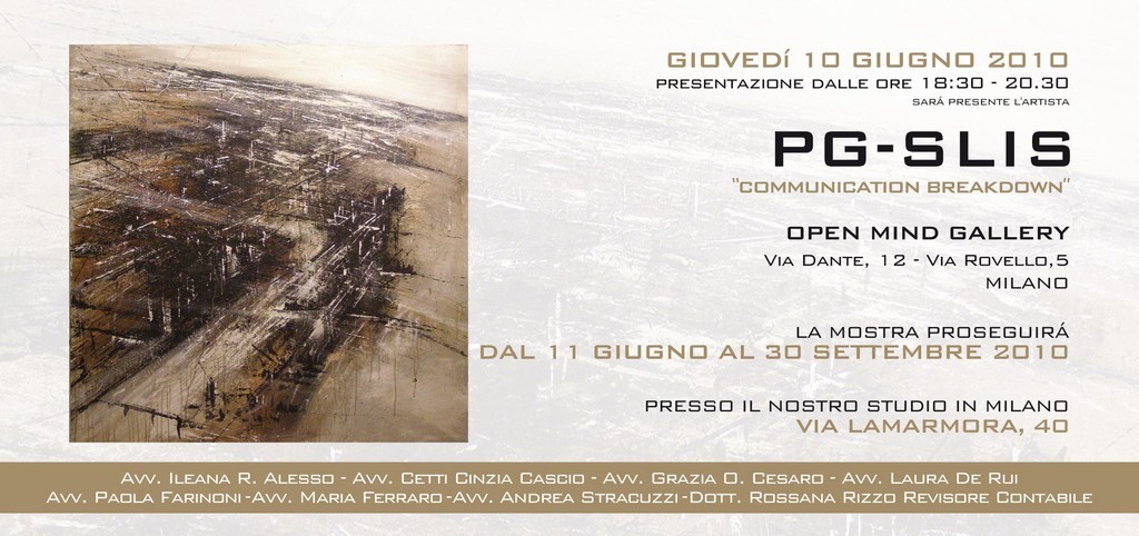 Da venerdì 11 giugno la mostra “Communication breakdown” si sposterà nello studio associato degli avvocati Alesso, Cascio, Cesaro, De Rui, Farinoni, Ferraro, Stracuzzi, in via Lamarmora 40, sempre a Milano, dove sarà visitabile fino al 30 settembre 2010.