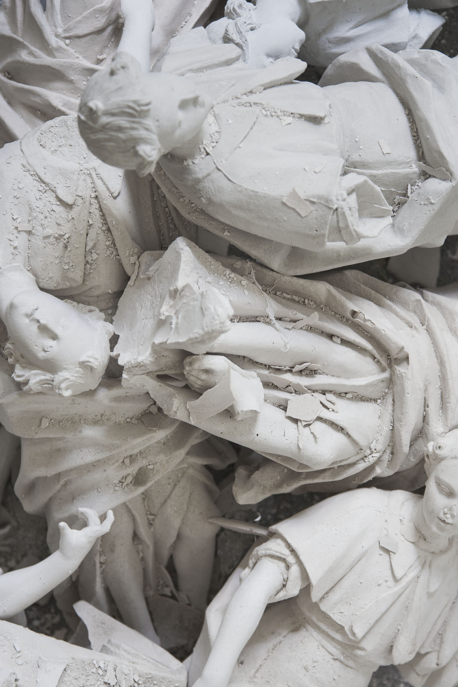 Gli oggetti-testimoni di una perdita sono per eccellenza le rovine. Documenti del naufragio del passato ma anche presagio di catastrofi future - complice il senso di tragedia creato oggi da tracollo ambientale, guerra in atto o incombente e crisi economica -, le rovine sono punti in cui si attua il corto circuito tra passato e presente che, Benjamin e Agamben insegnano, è proprio della contemporaneità. "Celestial Debris", un cumulo di rovine accoglie il visitatore nella prima stanza della galleria: sono frammenti di due calchi in gesso, il primo tratto da un’anonima statua barocca di un santo o angelo, il secondo dalla replica di un satellite obsoleto, una delle sculture che Topolovac - affascinato dal destino di queste macchine che, esaurita la propria funzione, continuano a vagare nell’atmosfera come una sorta di “spazzatura spaziale” - ha dedicato al tema (si tratta del bronzo Envisat, 2014-2015). Due oggetti celesti, uno antico, l’altro moderno, convivono sul pavimento della galleria come detriti che lo spettatore è costretto a calpestare. I rispettivi originali - il santo in legno dipinto e la scultura del satellite - si incontrano nella sala successiva, esposti in una teca insieme ad altri materiali. Molti di questi Bodenproben (un pezzo di vetro fuso, un vecchio elmetto, altri frammenti più piccoli) sono frutto delle esplorazioni che Philip Topolovac, risiedendo a Berlino, ha condotto nei siti bombardati di questa città popolata di rovine non solo degli anni del nazismo ma anche della guerra fredda. Simili a pezzi archeologici, non valgono tanto come reperti di archivio, strumenti di una registrazione storica del passato, quanto come chiavi di accesso a una realtà trascorsa da rivivere emotivamente. L’emozione è però sempre controbilanciata da una sfumatura di umorismo, qui discretamente segnalata dal naso rotto di una testa in gesso, posato nella teca accanto a un libro sulla ritrattistica romana. Il naso proviene da un autoritratto eseguito alla maniera delle statue imperiali; un lavoro che Topolovac ha abbandonato dopo essersi accorto che un altro artista aveva contemporaneamente avuto la stessa idea, e che ha ironicamente recuperato in modo indiretto. La sineddoche costituita dal naso di gesso chiama in causa la persona dell’autore, esso stesso partecipe del movimento tra antico e moderno, assenza e presenza, scomparsa e restituzione che è al centro del progetto.