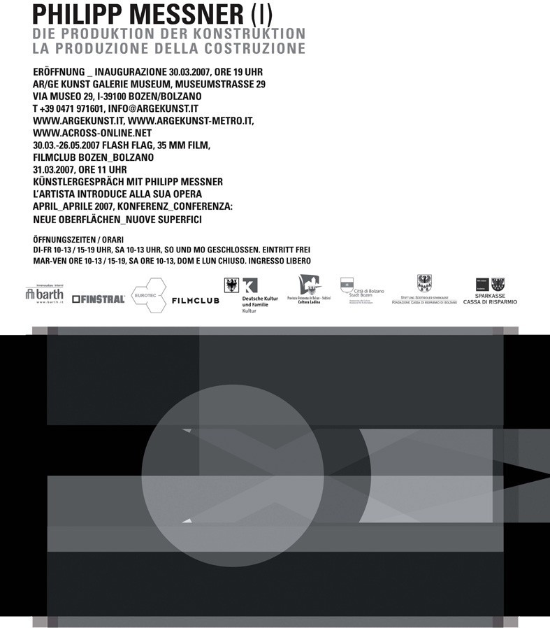 Da un punto di vista formale, Philipp Messner si richiama, con questa scultura, ad alcuni suoi lavori precedenti, nei quali si era confrontato con bandiere, ovvero con le forme simbolizzate di queste ultime – come è avvenuto per esempio nell’opera “Arsenale”, un’installazione presentata nel 2006 nel Kunstpavillon di Innsbruck, oppure nella performance “flash back”, presentata per la prima volta a Trento nell’ambito del Festival della Performance, nel 2006, oppure, ancora, nel film “Flash-Flag” (35 mm, 15’’, 2006), una pellicola nella quale le bandiere degli stati membri dell’ONU vengono riprodotte in bianco e nero vengono mostrate una dopo l’altra in una rapidissima successione, cosicché all’occhio non resta più tempo per percepire separatamente i singoli simboli. Questo film e il suo secondo film per cinema, “CYMK” (2006) verranno proiettati al Filmclub di Bolzano durante l’intera durata della mostra.