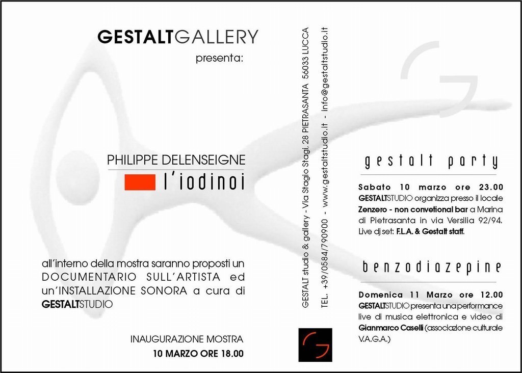 Triplo appuntamento con Gestalt Studio, nuovissima agenzia di comunicazione che propone un ricco programma per la propria apertura. Si parte sabato 10 marzo alle ore 18.00 con la presentazione della mostra di PHILIPPE DELENSEIGNE, dal titolo “L’IODINOI”, presso la sede di via Stagio Stagi 28, Pietrasanta. L’evento prosegue dopo le ore 23:00 con il GESTALT PARTY allo Zenzero, non-conventional bar a Marina di Pietrasanta (Via Versilia 92/94). Si finisce domenica 11 marzo alle ore 12:00 con la performance videosonora BENZODIAZEPINE, un progetto firmato Gianmarco Caselli da vivere presso lo spazio dell’agenzia.