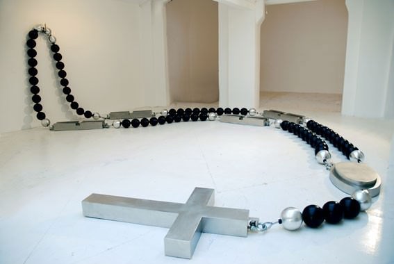 Perrin propone un’installazione di tre grandi sculture che rappresentano al meglio la sua concezione artistica: un rosario, nuovo ed ultimo lavoro, un anello ed una pistola in scala monumentale permettono di entrare nella sua poetica fatta di violenza e ironia, di gioco e di riflessione.