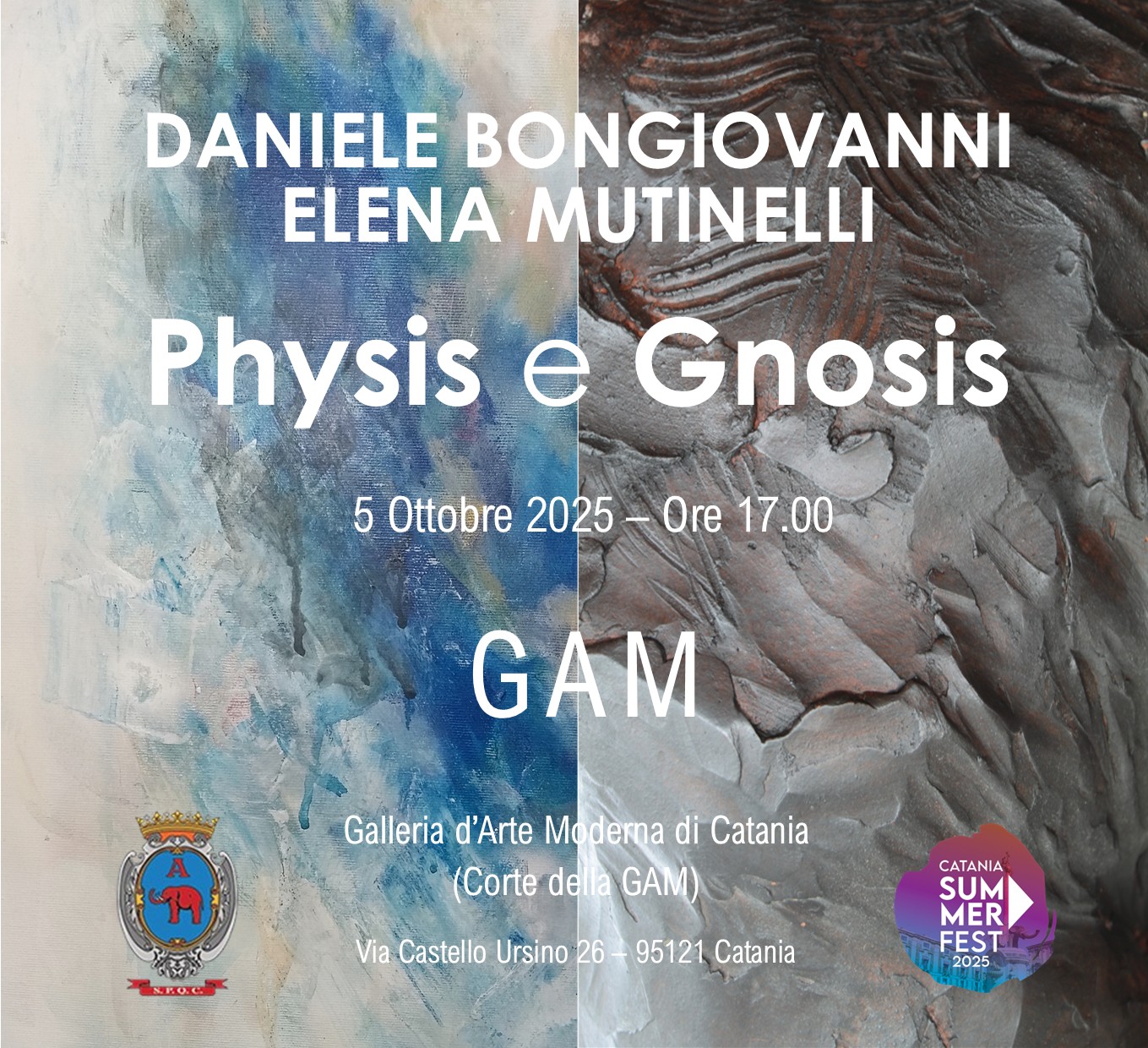 “Physis e Gnosis” è inserita nel programma del “Catania Summer Fest” 2025, importante rassegna internazionale di eventi artistici culturali promossa dal Comune di Catania.