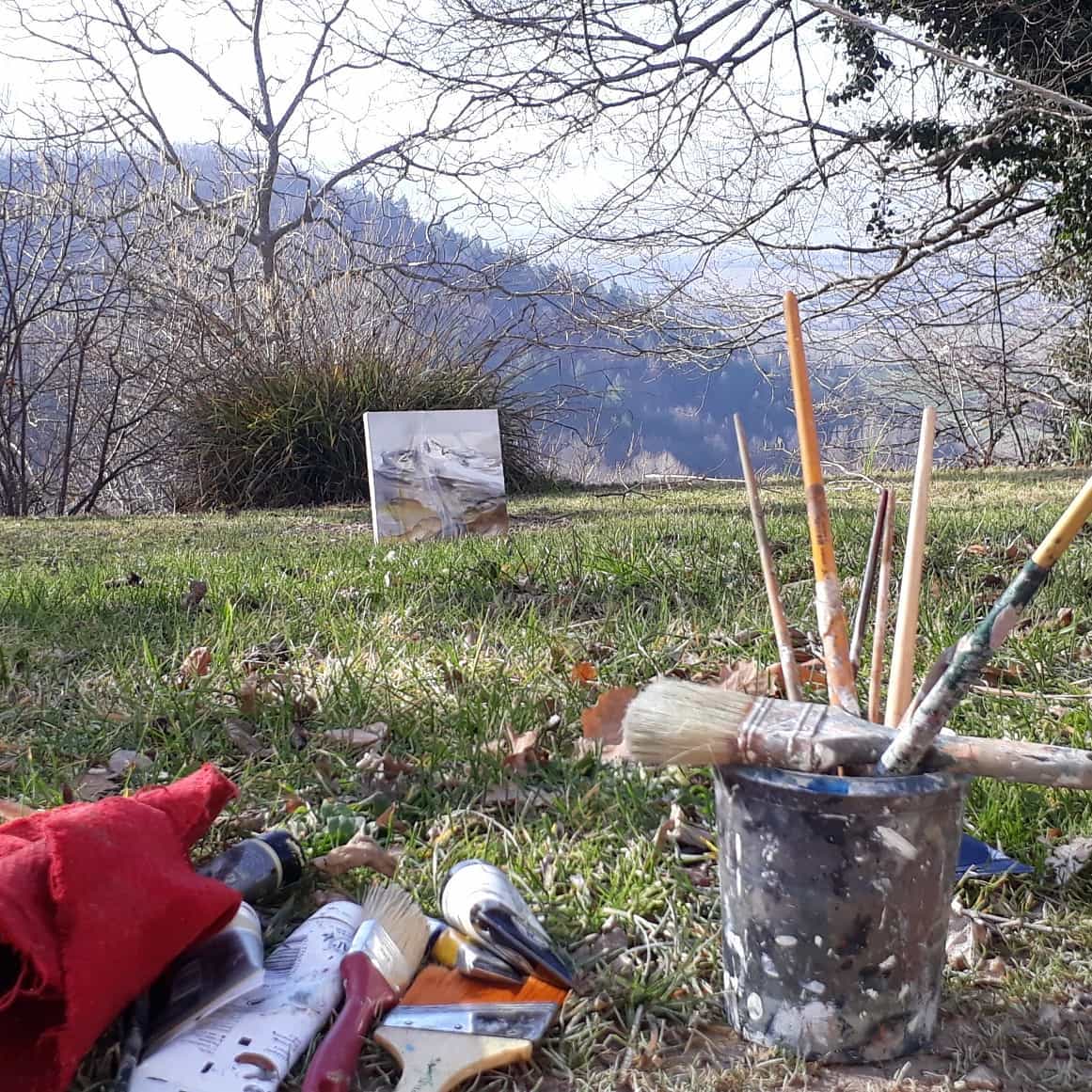 Mi ritrovo nel mio studio romano a ripensare alle giornate trascorse nelle Marche, a Casa Sponge. - scrive Angelo Belllobono - È straniante ritornare in quelli che sono stati i luoghi che hanno accolto le mie estati di bambino e che mi hanno fatto scoprire la montagna. Giornate che hanno accarezzato la mia esistenza. Dipingere dal pianerottolo della casa della famiglia di mia madre, come se gli occhi fossero i suoi, guardare lontano e scrutare l’Appennino. Gli strati d’aria e luce si sovrappongono e mescolano, impastano l’erba e la terra dei campi e restituiscono mille tonalità d’ocra, verde e marrone. Azzurri lievi disegnano i profili di colli e montagne gentili e poi, un po’ sopra il resto, il Catria e l’Acuto si mostrano per più di quanto sono, in una veste invernale incerta, evanescente. Allora la pittura cerca gli strati del tempo, la terra sotto e la terra sopra, i passi coperti e scoperti. Cerca il magma che risale e fissa le forme per qualche milione di anni per poi sgretolarle, per non abituare nulla alla certezza. Ecco che inverno e primavera si abbracciano e confondono gli occhi e i sensi di chi ci sta in mezzo. La pittura rallenta, osserva, elabora e un mondo si compie, si cancella, stratifica. Il corpo si muove ed è mosso, si carica e scarica, sa che lui non sarà per sempre. Sarà sempre un inizio di giovani a tempo e vecchi eterni, sarà sempre un tempo di giorni che si accendono e spengono e passi, primavere, inverni, estati e autunni, rumori e silenzi e un po’ di pittura che si asciugherà evaporando in altre luci. L’Italia è una grande ed unica provincia in cui germogliano e respirano scrigni di pura bellezza, non nostalgici, ma attivatori di modelli semplicemente perfetti. Non bisogna vivere con sensi di inferiorità scimmiottando un altrove che non appartiene ai suoi luoghi. […] “