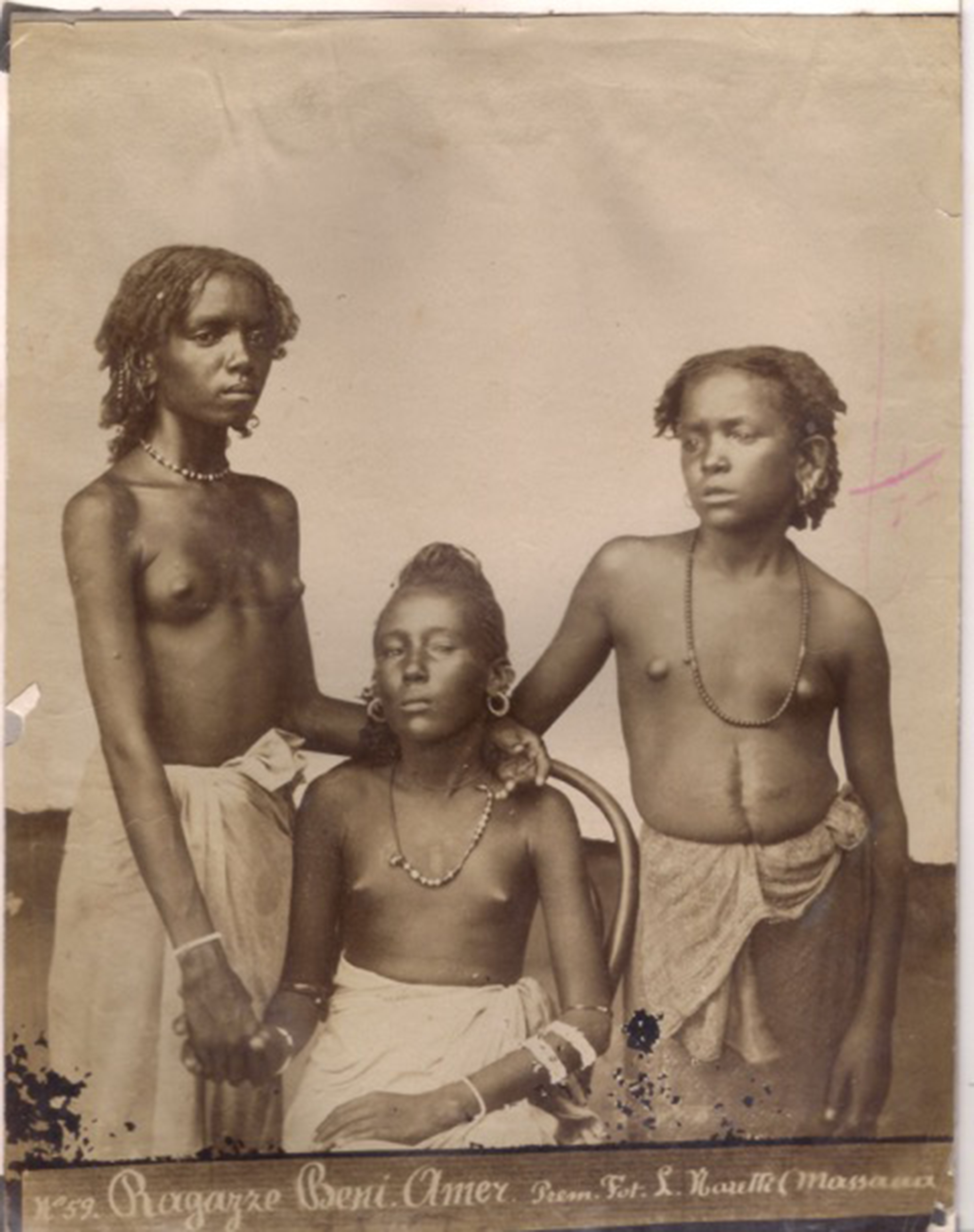 Ed è da qui che si arriva a Luigi Naretti e Pietro Marubbi, due dei più conosciuti fotografi etnografici che raccontano la società eritrea l’uno e quella albanese l’altro della seconda metà dell’Ottocento. Naretti è il primo vero “fotografo colono” che risiede stabilmente in Eritrea dal 1885, documentando l’impresa coloniale italiana con un’imponente produzione fotografica, in cui si riscontrano gli stereotipi e i temi dell’esotismo ed erotismo tipici dell’immaginario coloniale del periodo. Proprio per questo scatta prevalentemente in studio, ricostruendo l’ambiente indigeno con un intento antropologico, da un lato cercando di classificare l’appartenenza etnica dei soggetti e dall’altro realizzando molti nudi femminili richiamandosi al mito della Venere nera. In mostra alcune sue prove d'epoca (ri)scoperte nell'archivio della Biblioteca Antonelliana di Senigallia da uno storico locale, Leonardo Badioli.
