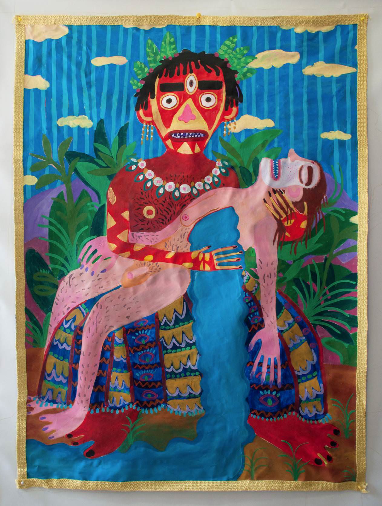 Andrea Fiorino (1990) fonde il sacro e il profano dei suoi figuri bestiali in una stessa materia; lo fa con forti, quasi esperimenti cromatici, e rielabora la storia dell’arte tradizionale. In un mondo quasi magico, paradisiaco, le figure nude sono ricoperte, quasi invase, dalla natura, selvaggia nelle forme e nei colori.