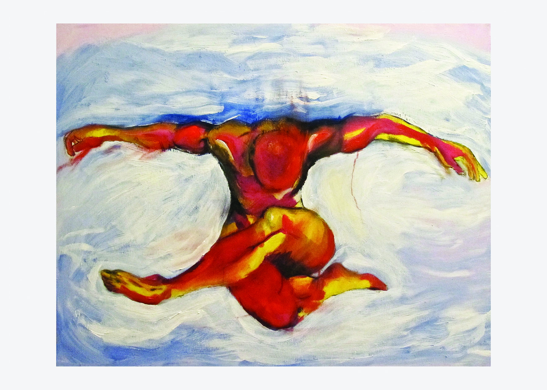 Gli sfondi monocromatici sono risolti per mezzo di una stesura di colori acrilici e ad olio saturi che tendono a staccare il soggetto, scontornandolo, veicolando l’attenzione totalmente al corpo nella sua esplicita nudità; certi sono tronchi, altri sembrano galleggiare in uno spazio privato di ogni punto di riferimento temporale, annientando l’importanza stessa di un ipotetico ambiente, di un contesto e di una storia al quale il corpo in questione possa appartenere.