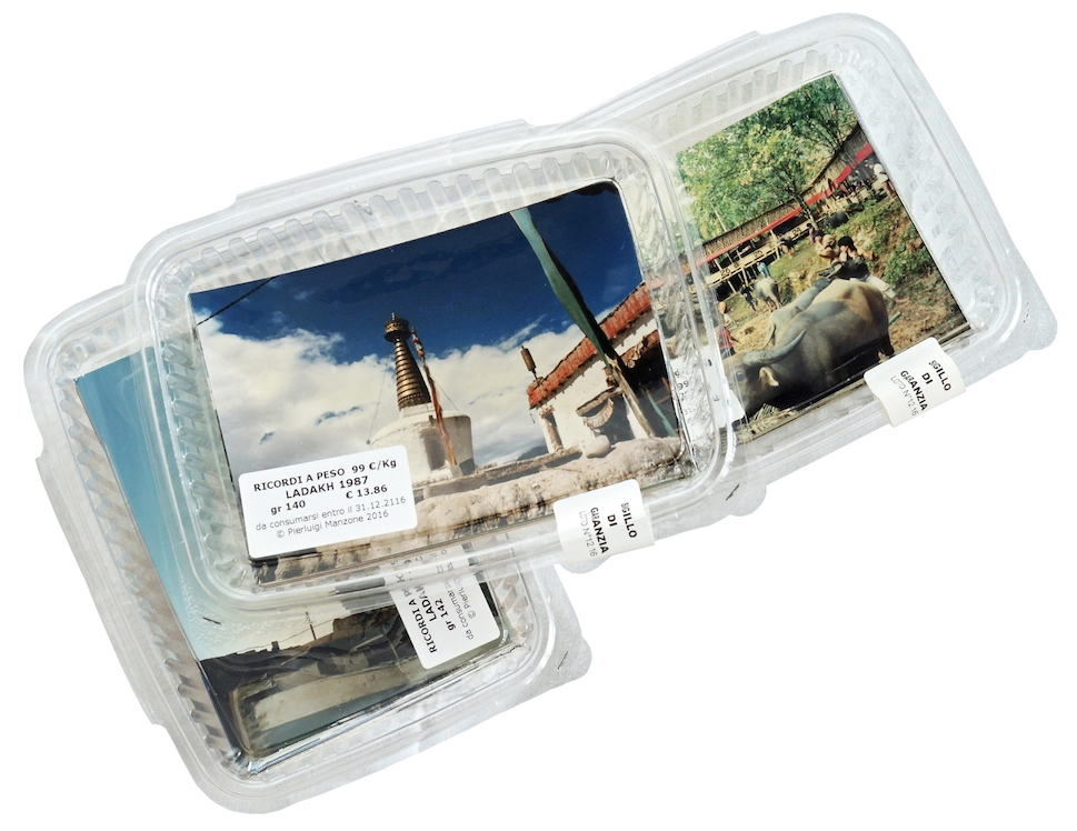 GRAN TOUR CONTEMPORANEO. Ricordi a peso. Di Pierluigi MANZONE Da bene culturale/documentario a bene di consumo: fotografie amatoriali d’anonimo prodotte negli anni ottanta del XX secolo: ricordi di viaggio per soddisfare nuovi desideri e destinazioni d’uso. 44 contenitori per alimenti con stampe colore 10x15 cm con indicato il loro peso complessivo in grammi.