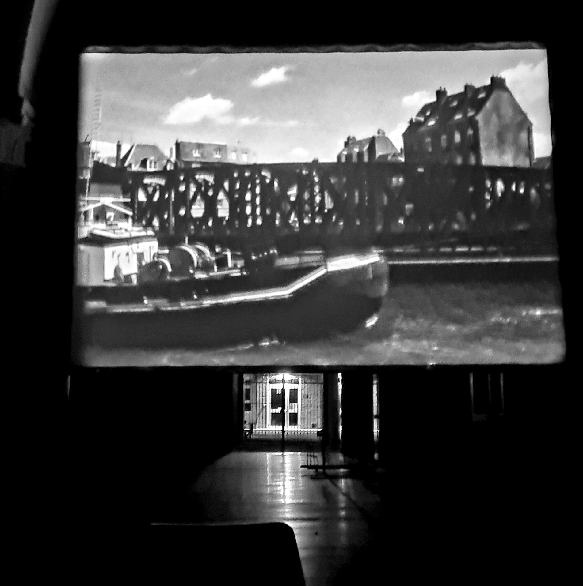 - all’interno di un portico, il portone sotto lo schermo sul quale scorrono le immagini di un film di Telemach Wiesinger