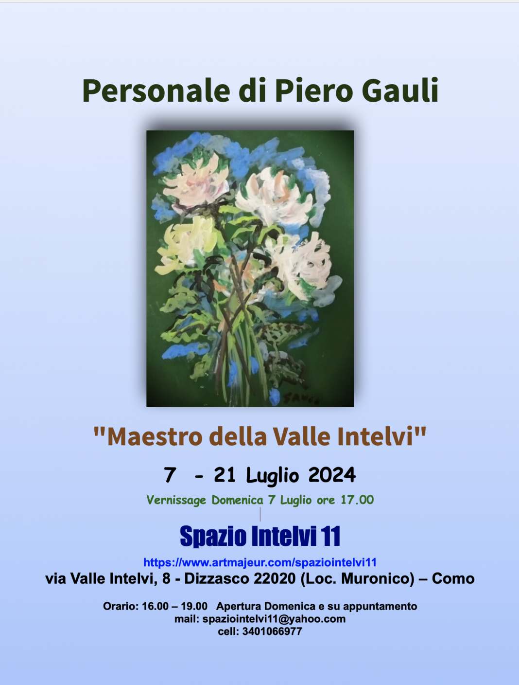In questa personale sono esposti i lavori di Gauli che vanno dagli anni '50 fino alle soglie del terzo millennio con alcuni dei suoi soggetti prediletti: le rose. le maschere, i paesaggi della valle Intelvi, i suoi trascorsi in Sicilia... Insomma un saggio della sua imponente produzione. Ciò nella speranza di contribuire a riportare l'attenzione su questo nostro grande artista che meriterebbe di essere rivalutato.