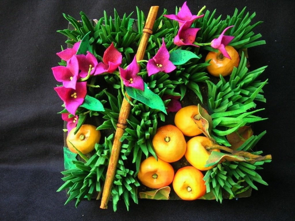 La mostra che Piero Gilardi ha ideato per gli spazi del Chiostro arte contemporanea presenta temi di frutta (uva, fichi d’India, datteri, angurie e meloni), temi di fiori (dalie nell’orto, rose nella vigna), una sequenza significativa di spiagge: i gusci blu dei molluschi punteggiano il grigio rosa dei lidi nordici dove vive la rosa rugosa bianca, i ricci viola sono presenze della spiaggia ligure dai toni grigi, mentre bianca è la luce che riflette la sabbia caraibica, impreziosita dalla madreperla