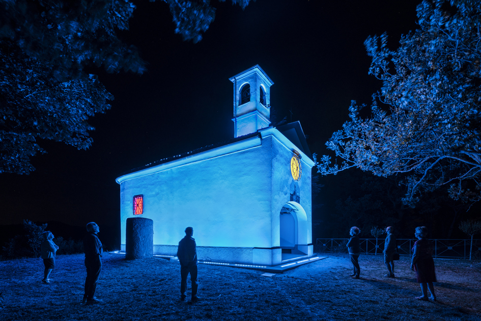 Il vincolo di non modificare le caratteristiche specifiche dell’edificio (struttura, percezione e colore bianco dell’intonaco), la visibilità data dalla posizione, la mancanza di illuminazione notturna, hanno costituito le premesse per la soluzione proposta: riprendendo la più interessanti ricerche artistiche sulla luce del XX secolo, le pareti esterne sono state “colorate” per gli esterni monocromaticamente di una luce Blu Oltremare, simbolo della trascendenza, di una luce giallo oro per il rosone della facciata e di una luce rosso vivo per la piccola finestrella sulla sinistra dell’abside. L’effetto ottenuto è di grande suggestione, sia per la visione da lontano che per quella più ravvicinata. Con il semplice intervento della luce, la piccola chiesa è stata in questo modo trasfigurata, diventando “faro” luminoso nel bellissimo panorama piemontese.