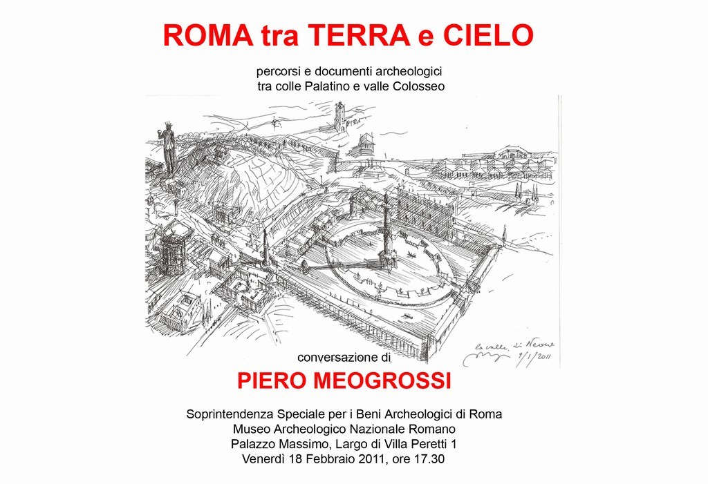 Studi di topografia antica, racconti e disegni in apparenza visionari che Piero Meogrossi misura fisicamente orientato in una lettura di realtà urbana su livelli e dati storici ancora dispersi e per lo più sconosciuti, posti in equilibrio tra terra e cielo.