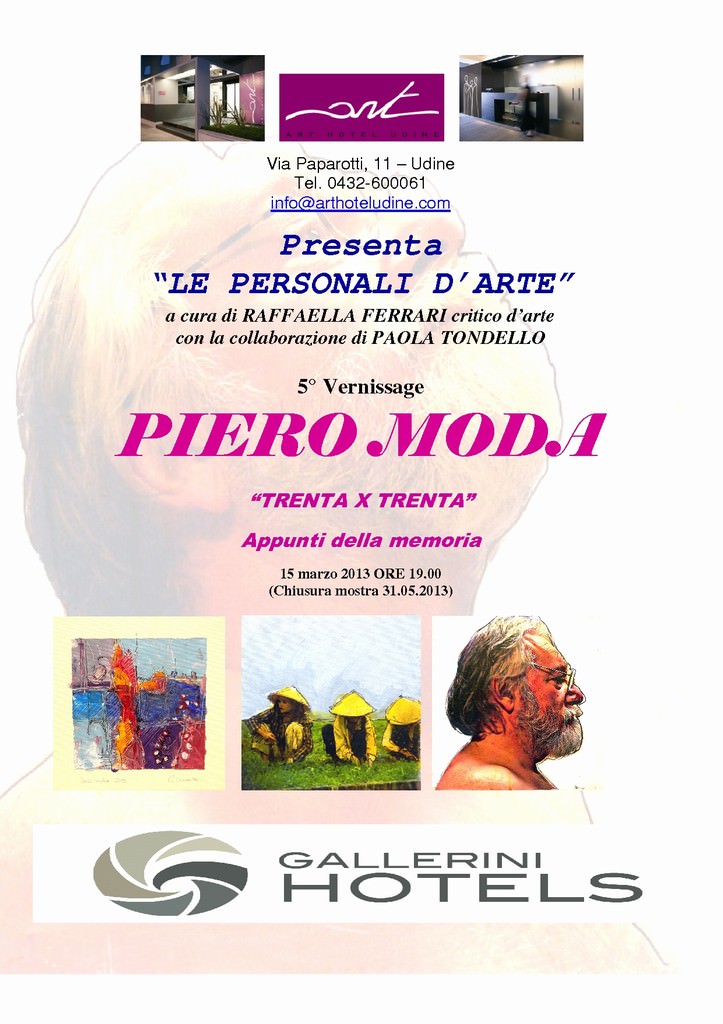 Art Hotel Udine, Via Paparotti, 11, Raffaella Ferrari critico d’arte in collaborazione con Paola Tondello Presentano il 5° vernissage delle: “Le Personali d’Arte” Mostra personale dell’artista Piero Moda, titolo della mostra “trenta x trenta” appunti della memoria, venerdì 15 marzo ore 19.00, la mostra chiuderà il 31 maggio. Intrattenimento musicale a cura dell’Associazione culturale “Il Cassonetto”, con il cantautore Jvan Moda