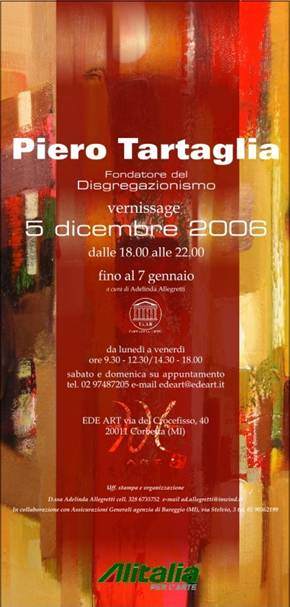 Sublimazione. Se c’è un termine che possa cercare di fornire una chiave di lettura per le opere di Piero Tartaglia è proprio questo. Sublimazione dell’oggetto, del quotidiano, della realtà che ci circonda, delle emozioni che ci offuscano la mente o che attanagliano il cuore, dei ricordi che balzano alla memoria, della paura. Sublimazione di ogni aspetto della vita. Dietro ogni opera d’arte prima dell’artista c’è l’uomo - che vive, sente, a volte gioisce ma molto più spesso soffre - , ma quando ciò che gli antichi chiamavano dionisiaco prende il sopravvento, quando la divinità si impossessa dell’anima umana, travolgendola ed annientando ogni rigor di logica, allora è l’Artista ad emergere ed a divenire egli stesso un demiurgo. E nelle opere di Tartaglia questo scarto tra quotidianità e sublime è talmente evidente che quasi si rende tangibile. L’azione della pennellata, la ricchezza cromatica, le forze centrifughe e centripete che si ostacolano a vicenda creando un’esplosione di energia che la bidimensionalità del supporto a stento riesce a trattenere, contribuiscono a rendere viva, palpitante ogni sua creazione.