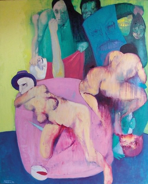 Nel catalogo che ha presentato nel novembre del 2002 la prima edizione della mostra “Garbuglio del bilico” che la Presidenza del Consiglio Comunale di Firenze con l’Accademia delle Arti del Disegno ha promosso e curato nei locali dell’Accademia stessa, Marco Fagioli definisce i dipinti di Tredici “composizioni di figure avvolte e mutile, come la messa in scena della nostra vita quotidiana, capovolta rispetto all’immagine ufficiale che essa vuole offrire di se stessa e inserita in una società vista come teatro di una festa violenta con i suoi riti e sacrifici”.