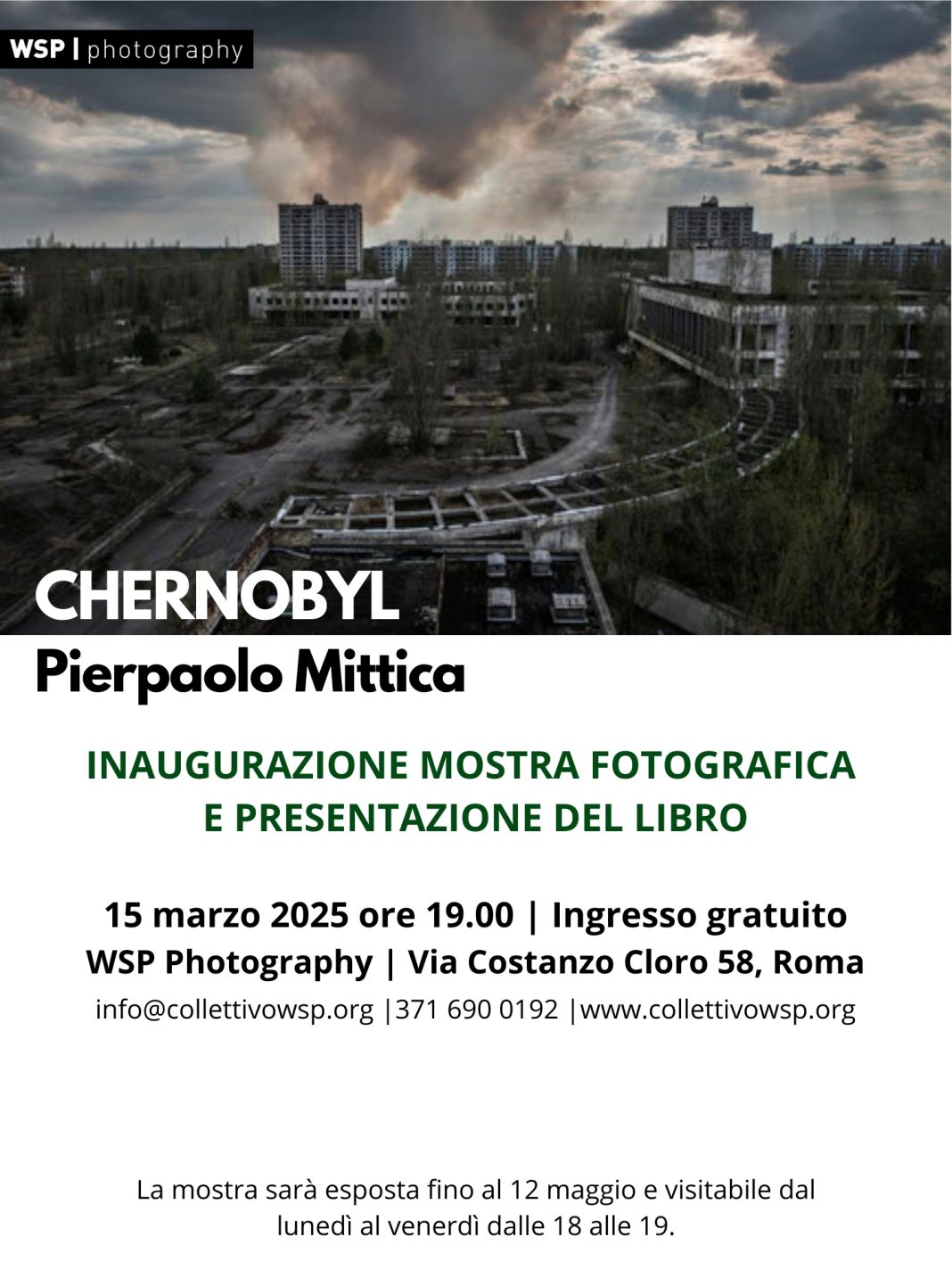 WSP Photography è lieta di presentare “Chernobyl” la mostra fotografica di Pierpaolo Mittica che inaugurerà sabato 15 marzo alle ore 19 presso la nostra sede in Via Costanzo Cloro 58, Roma. In occasione dell’inaugurazione interverrà̀ l’autore che presenterà anche il libro fotografico “Chernobyl”.