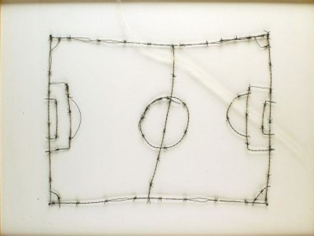 In Gioioso Gaudioso Doloroso un inginocchiatoio aspetta i fedeli, è sistemato davanti ad un campo da calcio fatto di spine, come icona di un nuovo martirio domenicale.