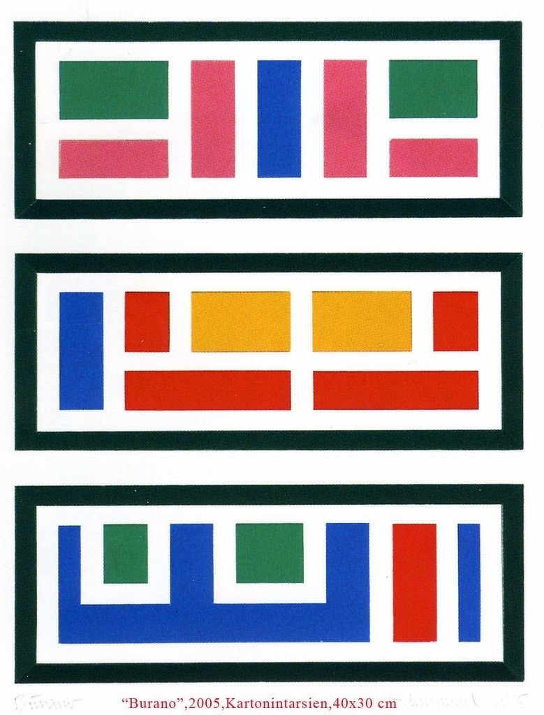 attraverso nessi geometrici e matematici. L’ortogonalità non indica tanto l’opposizione tra la linea orizzontale e quella verticale, quanto il punto del loro massimo equilibrio. Analogamente l’uso del colore rimanda non tanto alla terza dimensione - dei volumi e della profondità-, ma alla quarta, che mette in campo il concetto del tempo e ne determina lo scorrimento attraverso gli accostamenti cromatici.