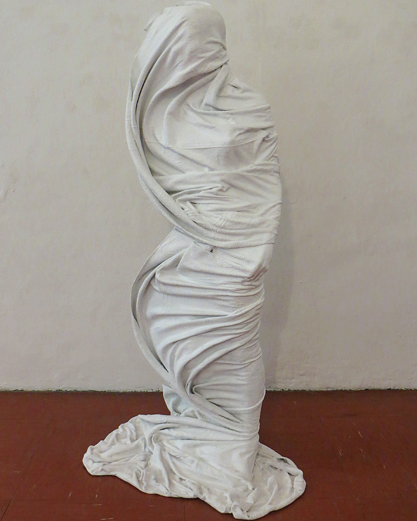l’esibizione presenta tre sculture in resina ipossidica ed otto quadri con drappeggi creati con
