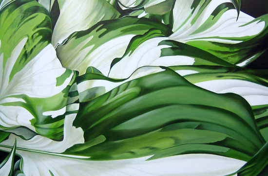 Il suo approccio è volutamente, e quasi ossessivamente, decorativo. L’uso dell’olio su tela permette di curare nel minimo dettaglio la rappresentazione del volume sinuoso, petalo o foglia che sia. Quasi come un tessuto la figura appare liscia, ruvida, increspata, setosa.
