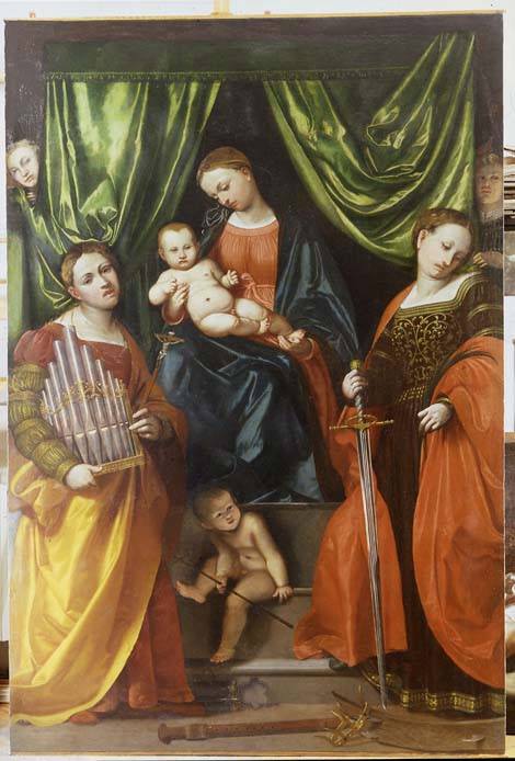 Il dipinto attribuito al Romanino ci riconduce a una Sacra Conversazione. Il dipinto restaurato ci mostra una Madonna col bambino, ai lati della quale sono poste due sante martiri: Santa Caterina d¹Alessandria, alla destra, e santa Cecilia, alla sinistra. Ai piedi della Vergine è collocato San Giovannino. Il mondo della salvezza si concentra nella presentazione di un bambino, sorretto da una donna, simbolo della Chiesa. Il figlio di Dio è presentato all¹umanità, ai testimoni che hanno accettato la morte, pur di non abiurare la propria fede.