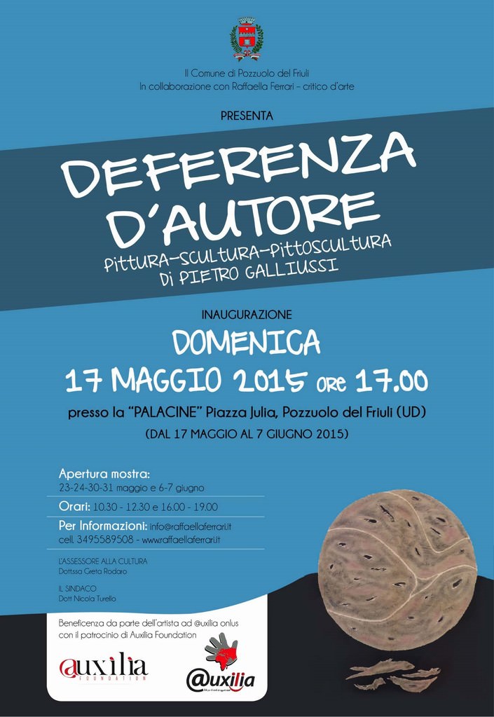 In collaborazione con Raffaella Ferrari – critico d’arte- presenta-DEFERENZA D’AUTORE-pittura-scultura-pittoscultura-di PIETRO GALLIUSSI Inaugurazione Domenica 17 maggio 2015 alle ore 17.00 Presso la “PALACINE” Piazza Julia, Pozzuolo del Friuli (UD) (dal 17 maggio al 7 giugno 2015) Assessore alla Cultura Dott.ssa Greta Rodaro, Il Sindaco dott. Nicola Turello