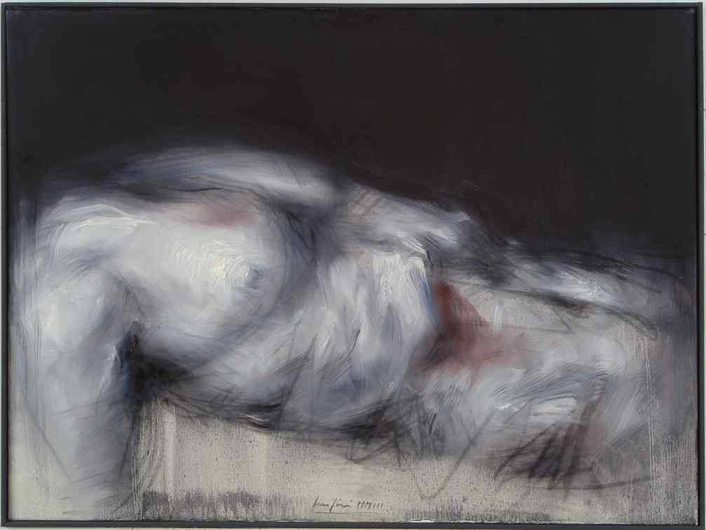 Pietro Lenzini conduce ancora una volta la sua indagine in direzione di una rilettura di temi antichi; ma tagliente e sulfurea è la sua pittura, i timbri cromatici sono lividi e folgorati da luci baluginanti.