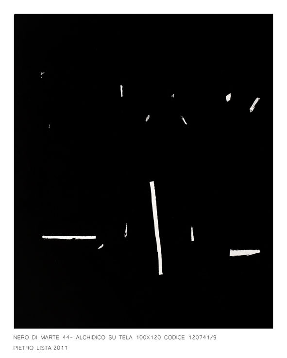 La galleria the Apartment è lieta di presentare a Napoli la personale del Maestro Pietro Lista dal titolo ”Nero di Marte 44” . La mostra , che sarà inaugurata il 26 gennaio 2012 alle 18.30, e durerà fino al 5 marzo 2012, prende il titolo dal colore usato dal Maestro in questi suoi nuovissimi lavori, che è appunto il Nero di Marte 44 . Curatrice della mostra è Alessandra Redaelli.
