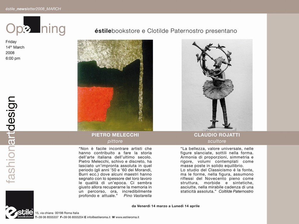 Questo evento è l’incontro di due artisti che nonostante la differenza cronologica hanno molto in comune. Melecchi , le sue superfici e la sua “materia”, ben si amalgamano con le plastiche forme dei bronzi di Rojatti. Un “passaggio” trasversale capace di unire mirabilmente mani ed epoche diverse