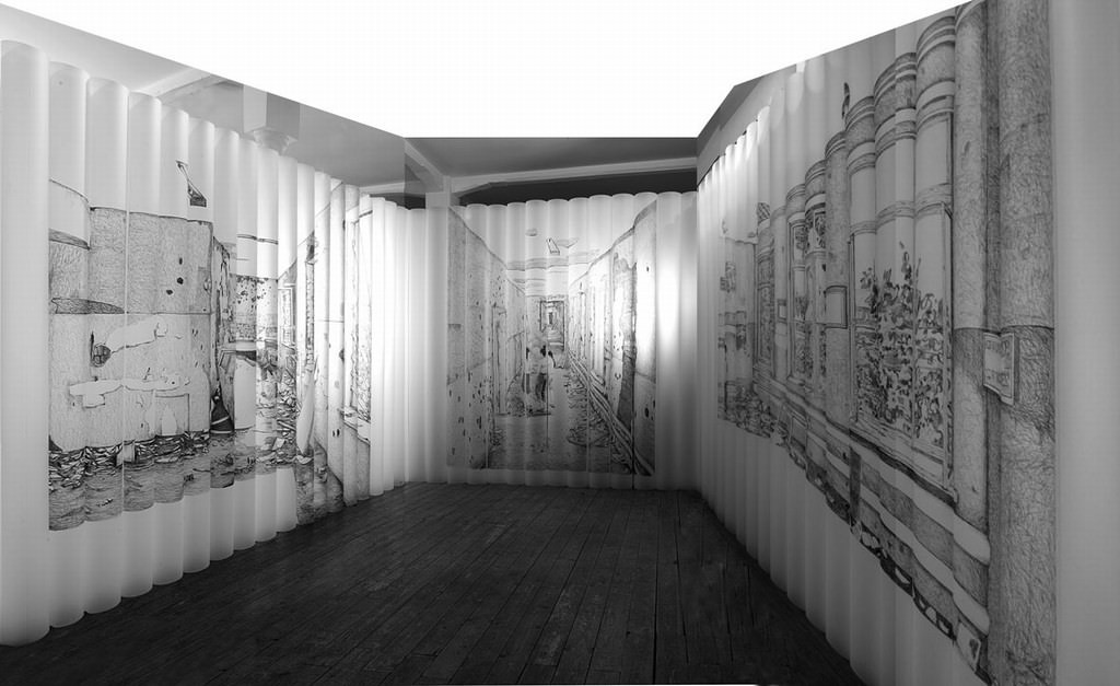 Dice Angelo Capasso nel catalogo: “L’installazione, che Pietro Ruffo realizza alla Galleria di Pino Casagrande, propone la possibilità di vivere una realtà storica divaricata tra presente e passato, attraverso una sua riattualizzazione in tutti gli elementi costitutivi: il mito, la memoria, il paesaggio, il presente, l’azione. Dopo aver prodotto un rituale di vita, attraverso il seminario con i bambini che sono stati testimoni dell’attentato dei fondamentalisti islamici alla loro scuola. Ovvero dopo aver confrontato la propria infanzia con dei bambini, e messo a loro disposizione la propria abilità di creatore, in quanto appartenente alla razza dell’arte mentre l’Uomo appartiene ad una categoria plurale (l’artista appartiene ad una categoria singolare), il compito più gravoso è quello di confrontarsi con la morte, con la tragedia, e con la disperazione assoluta che quel fatto ha segnato nella storia. Lo fa ricostruendo un tempio antico, in forma moderna: ha disposto una serie di colonne, retaggio di una tradizione classica dell’arte, senza però voler richiamare quella tradizione antica, rivolgendosi invece ai linguaggi del presente, alla carta, alla matita, ai colori acrilici”.