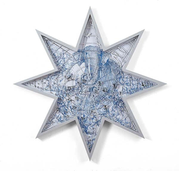 La grande Migrazione a forma di stella dell’invito riassume il tema del percorso espositivo conducendo lo spettatore attraverso un viaggio al di sopra del mondo. L’artista introduce infatti alla già nota prospettiva cartografica quella astronomica. Popoli di etnie differenti, animali di ogni paese si muovono sul globo terraqueo osservati dall’alto delle figure mitologiche delle costellazioni.