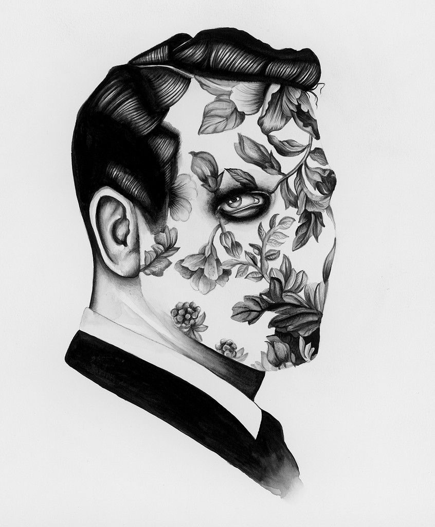 divisa, volti che contengono fiori o altri corpi, e poi persone in attesa su panchine e volti di